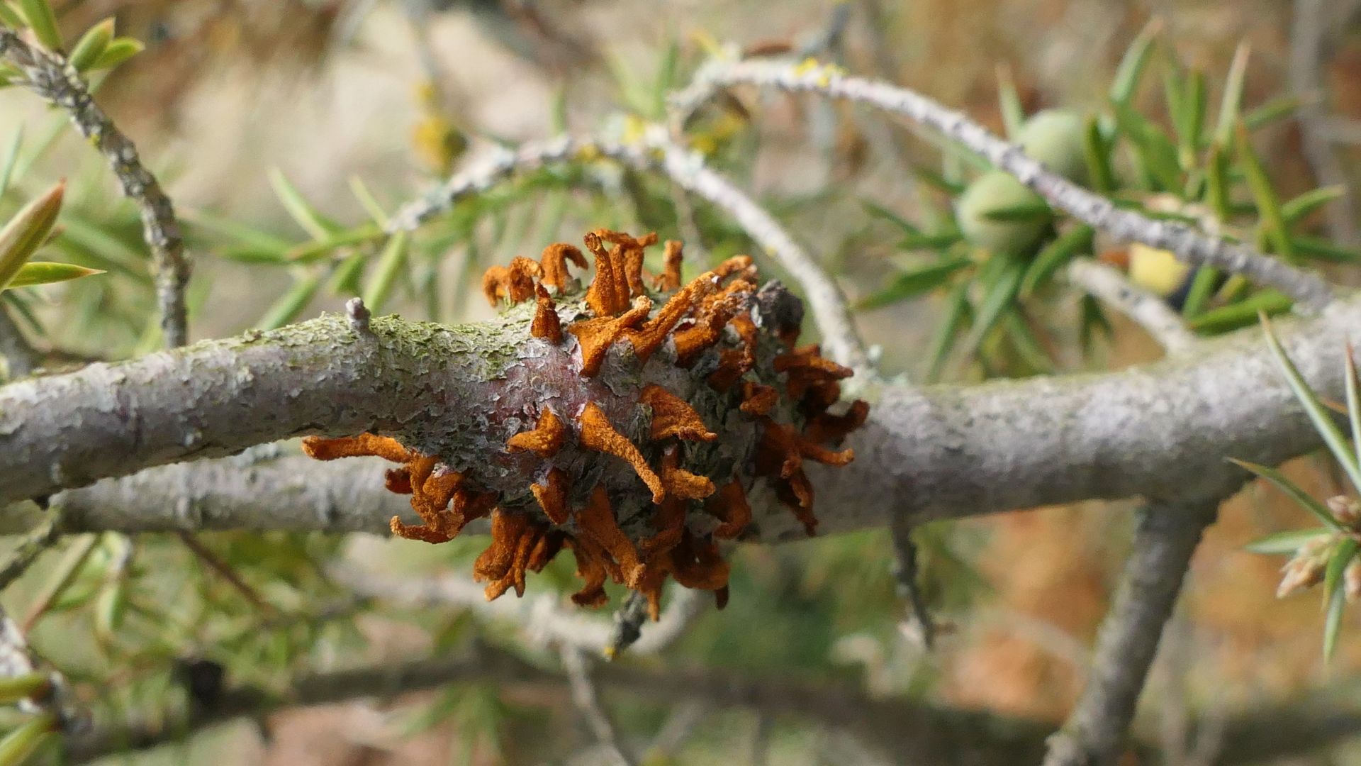 [Korrektur der Pilzart (es ist KEIN Birnengitterrost) durch Björn, s.u., und vielen Dank dafür]