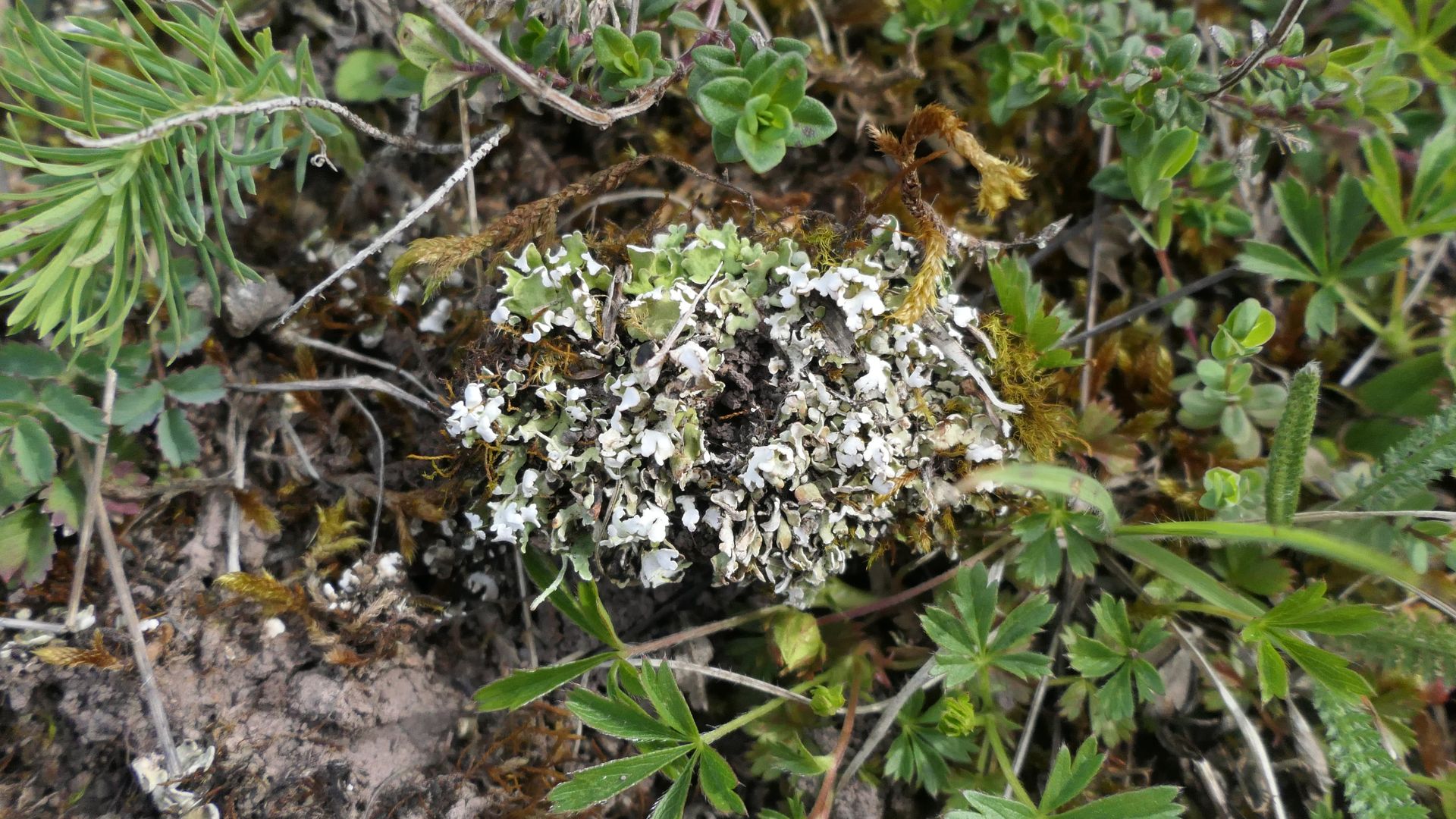bläulich-graue Kügelchen, braune Schüppchen und schwarze Klumpen - typische Erdflechten.