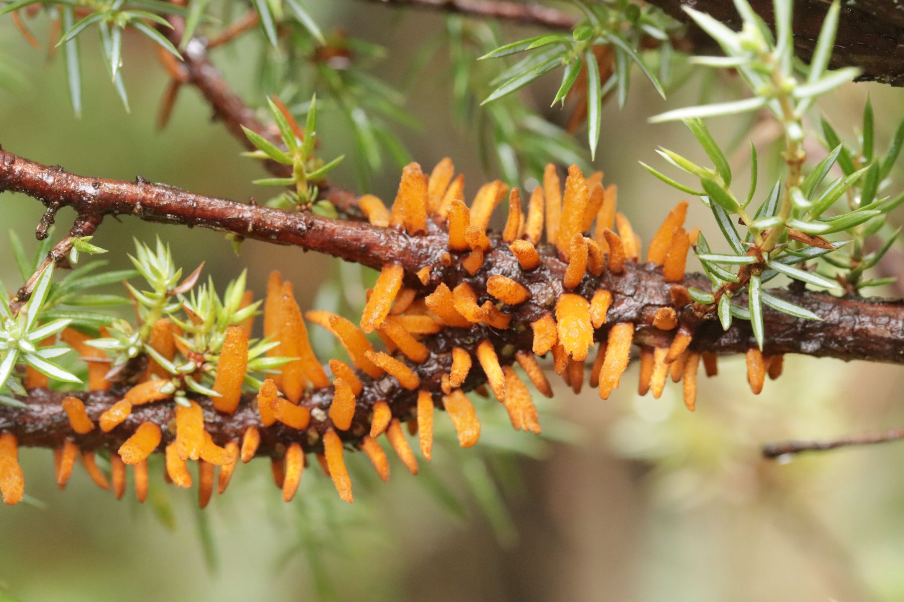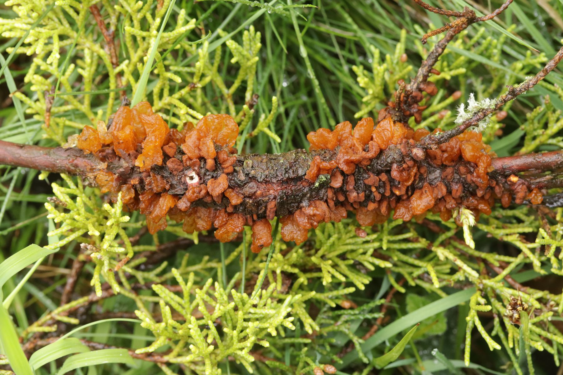 Nr. 8 ist nicht der Birnengitterrost Gymnosporangium sabinae, sondern der Weißdorngitterrost Gymnosporangium clavariiforme. Die beiden Arten unterscheiden sich durch die Wahl des Telienwirts: G. sabinae geht nur auf Juniperus sect. Sabina, während G. clavariiforme auf Juniperus communis geht. Ansonsten sind die beiden Arten aber auch makroskopisch unterschiedlich. G. sabinae bildet orange-braune Telien, die im Vergleich zur Höhe relativ breit sind, während die Telien von G. clavariiforme lang und schmal sind und im feuchten Zustand mehr gelb als orange sind.