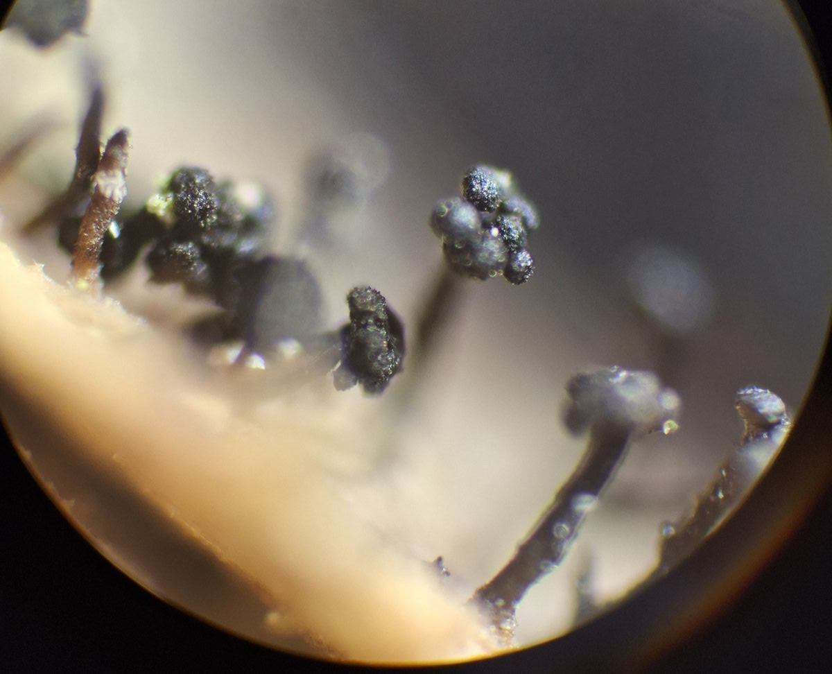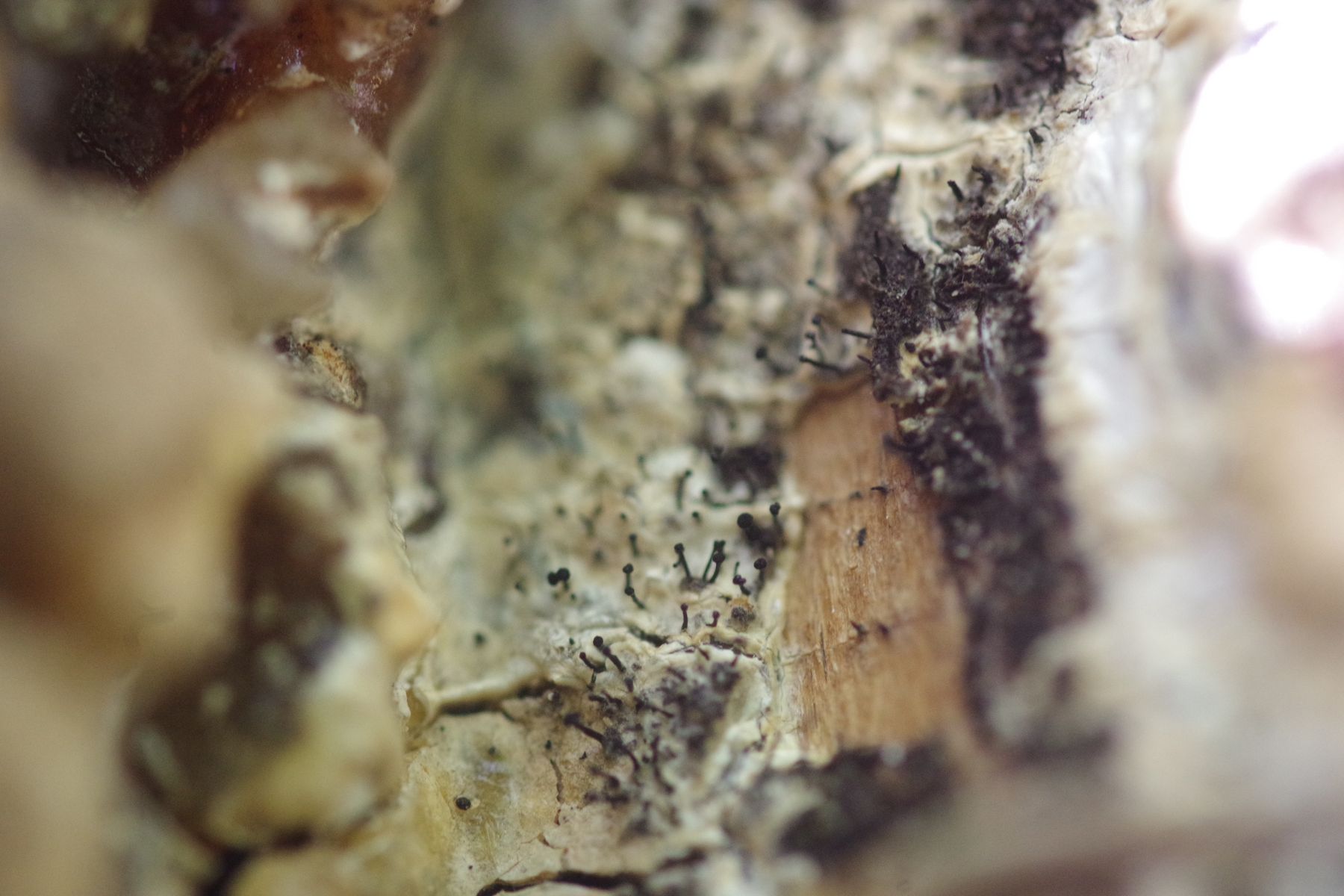 der Schlüssel für die Stecknadelflechten bei Italic fragt bei Chaenothecopsis auch nach dem Substrat Baumharz. Gelegentlich schaue ich mir daher harzige Fichten an. Und heute gab es dann auch einen Fund auf Harz. Kein alter Baum. In einem Bachtal geringfügig über dem Auwald. Nichts außergewöhnliches.