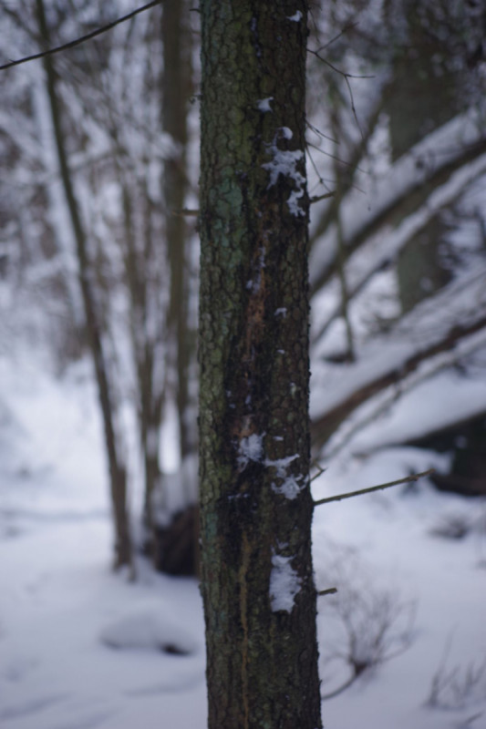 der Schlüssel für die Stecknadelflechten bei Italic fragt bei Chaenothecopsis auch nach dem Substrat Baumharz. Gelegentlich schaue ich mir daher harzige Fichten an. Und heute gab es dann auch einen Fund auf Harz. Kein alter Baum. In einem Bachtal geringfügig über dem Auwald. Nichts außergewöhnliches.
