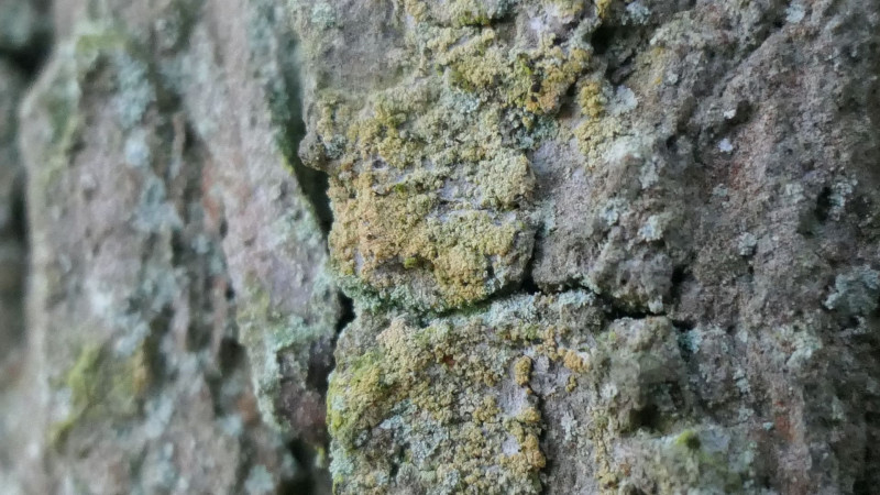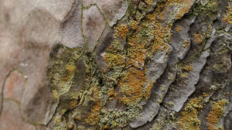 achte mal auf stellenweise gelb-orange bis ocker-braune Krusten z.B. an Kiefern und alten Eichen, oft direkt am Wegrand.