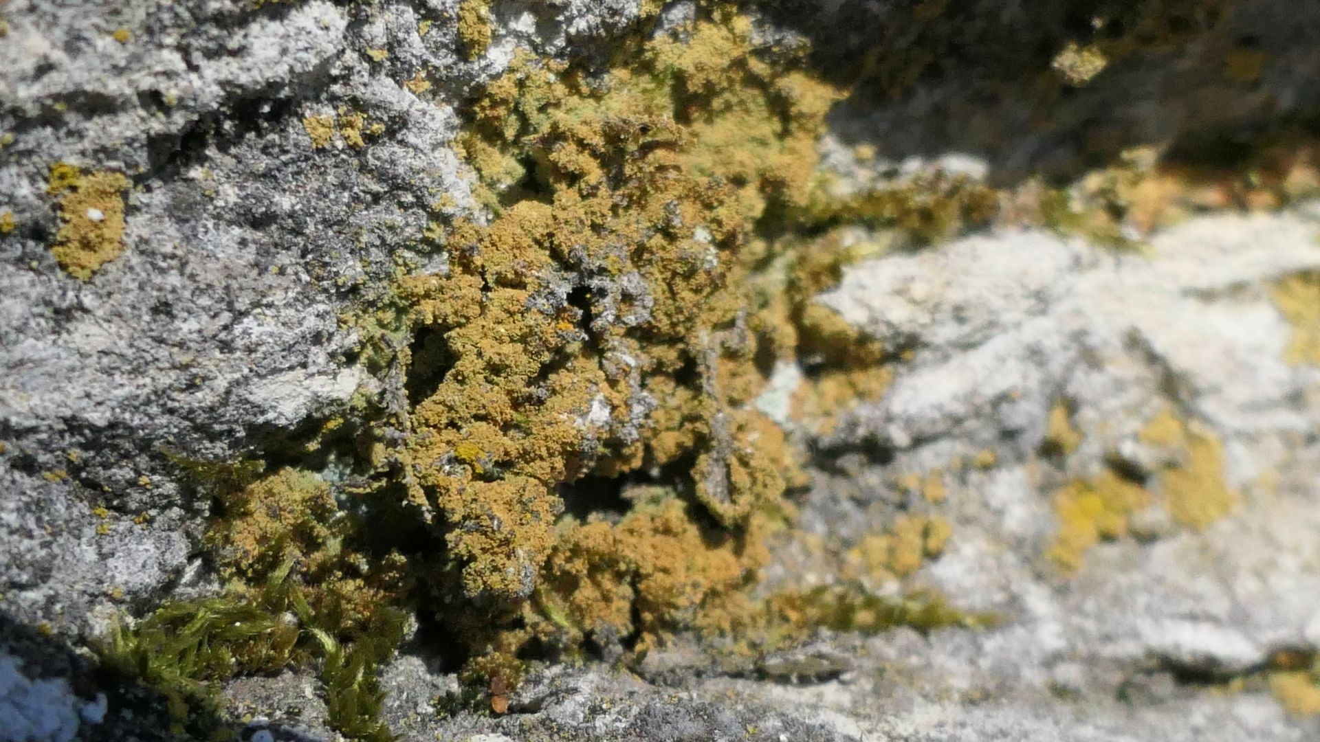Bild 5 Wahrscheinlich eine sterile Leproplaca chrysodeta, mit einem senfgelben, leprösen Thallus auf Kalkmoosen und direkt auf Kalkstein. Nicht näher untersucht.
