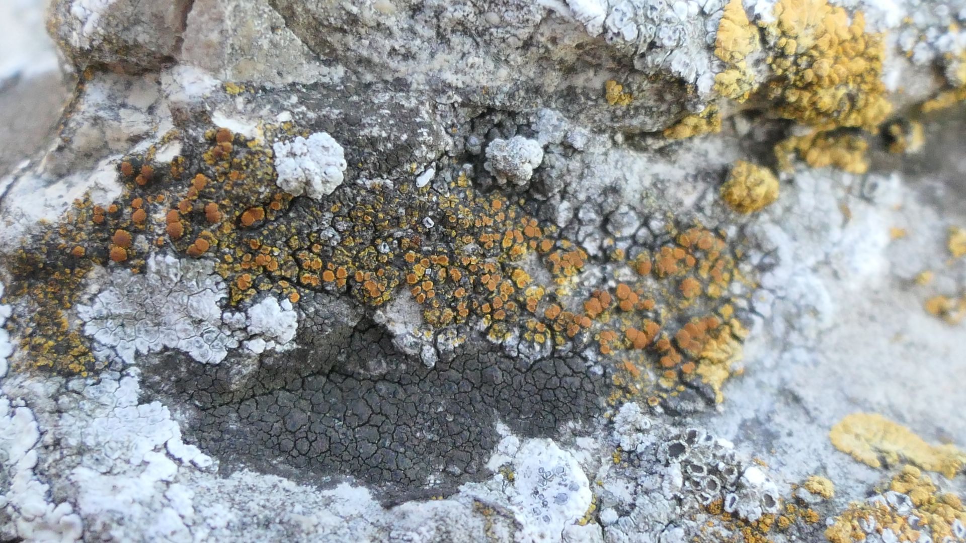 Bild 13 Ein weiterer Flechtenparasit neben/auf Protoparmeliopsis muralis (als weißliche Kalkform links vorne mit im Bild).