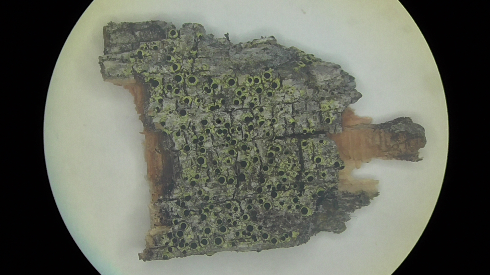 Heute habe ich die ziemlich seltene Krustenflechte Cyphelium tigillare gefunden.