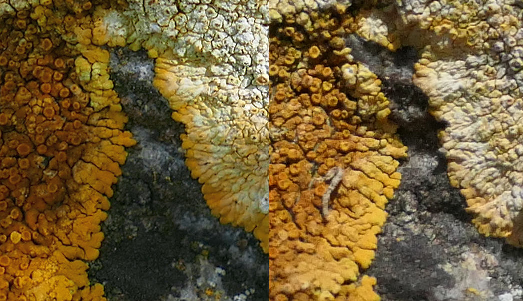 Ich wähle zwei Bildausschnitte, in denen zwei Flechten dicht benachbart sind, da sich die Lücke hier aus zwei Richtungen schneller schließt und ein Vergleich leichter fallen sollte: