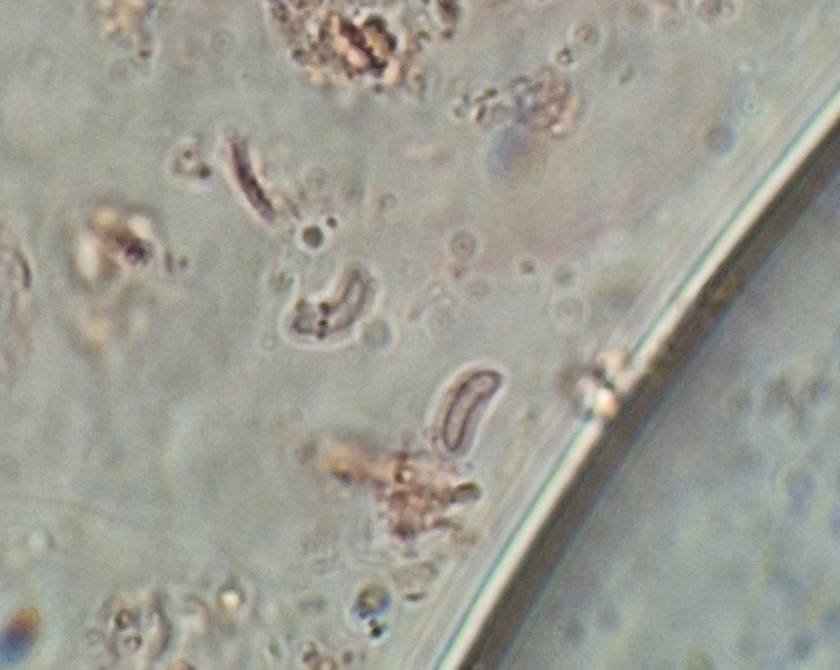 Sporen nur wenige vorhanden, ca. 6*2 µm, teils gebogen