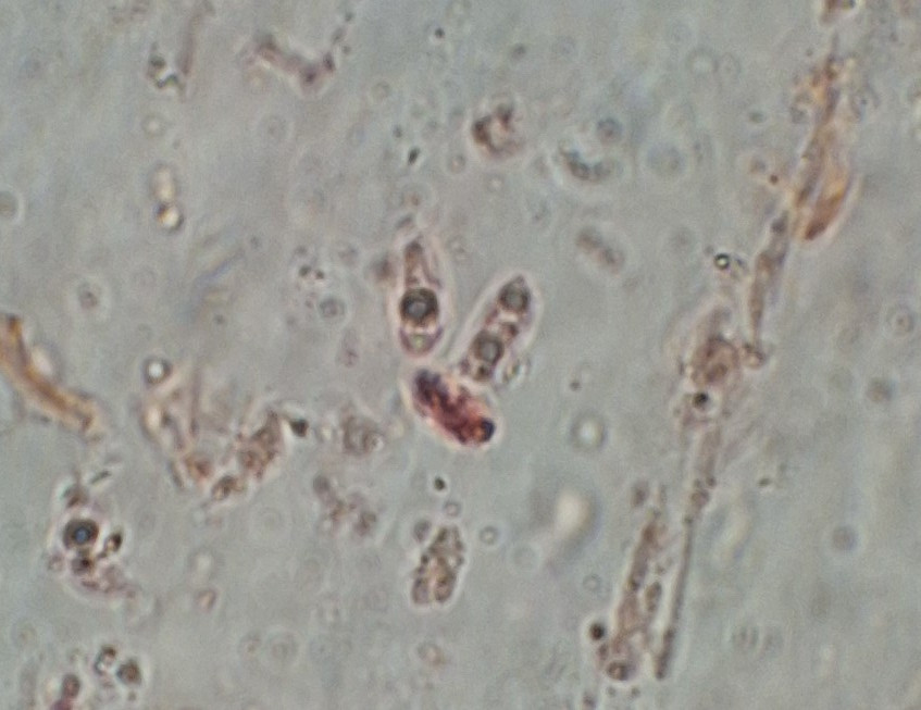 Sporen nur wenige vorhanden, ca. 6*2 µm, teils gebogen