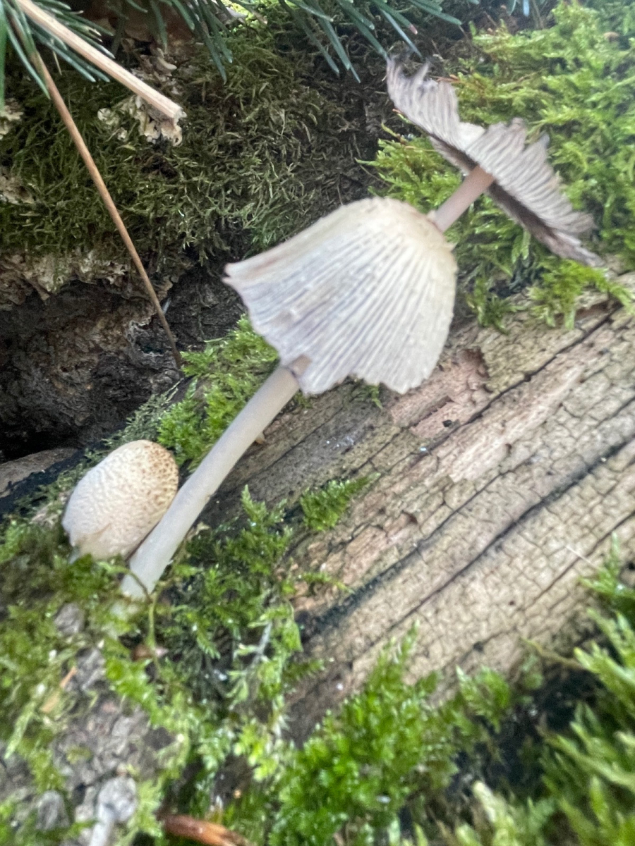 Die zweite Art, mit den schlanken weißlichen Stielen und den gerieft wirkenden Hüten, das sind Tintlinge. Wenn solche Arten am Vergehen sind, dann zerfließt das wie zu einer Art "Tinte", so eine schwarze flüssige Geschichte.