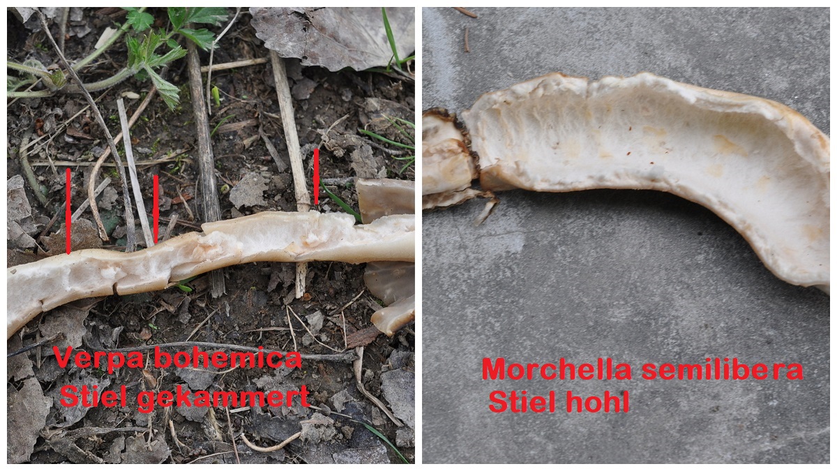 Ein weiteres Detail ist wichtig.Bei Verpa bohemica ist der Stiel nur ganz oben flach angewachsen, aber bei Morchella semilibera ist der Stiel mit dem Hut zu einem Drittel verwachsen siehe Bilder