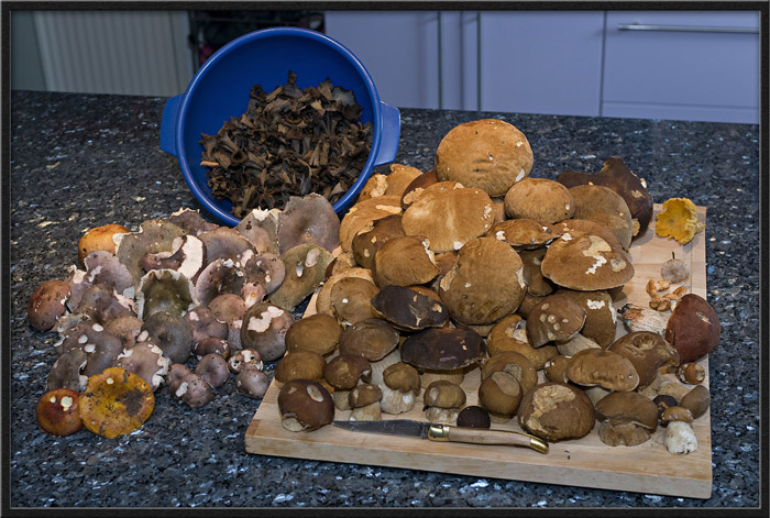 Heute ging es wieder rund, endlich auch einige Totentrompeten, diverse Täublinge, darunter den Goldtäubling welcher hier nicht sehr häufig ist, die Semmelstoppelpilze sind noch sehr klein, in einer Woche wird das wohl besser werden. Nocheinmal recht viele schöne Sommersteinpilze und einige Rotkappen. Nur wenige Pfifferlinge bislang, aber da schau ich morgen mal an einer anderen Stelle.
