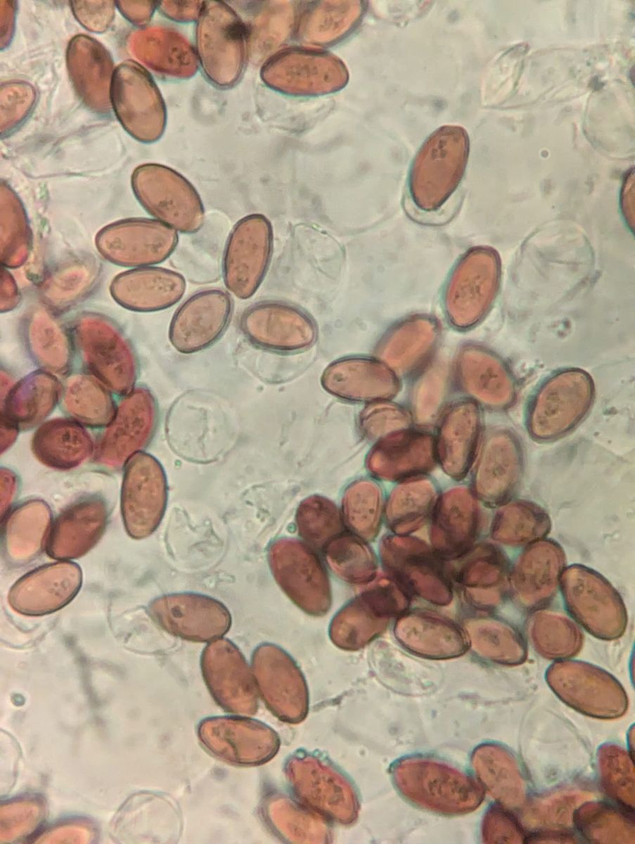 Sporen erschienen zunächst punktiert oder rau, allerdings täuscht das vielleicht und der Inhalt ist körnig (?). Schmal zitronenförmig, mit seitlichem Apiculus und dezentralem/schrägen Keimporus. 11,5–12,5 x 6–6,5 µm.