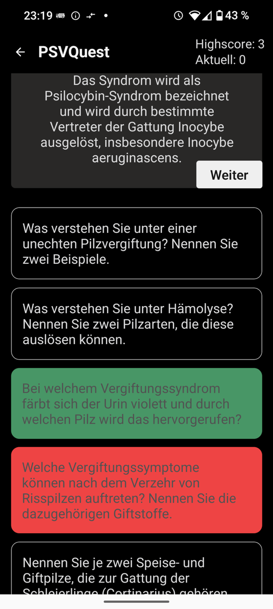kann es sein, dass das PSV-Quest noch Fehler enthält? Fliegenpilz enthält doch vor allem Muscimol und Ibutensäure, dagegen kaum Muskarin.