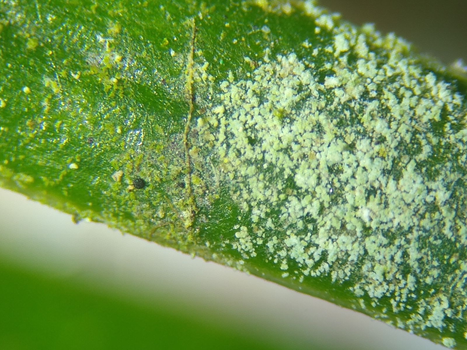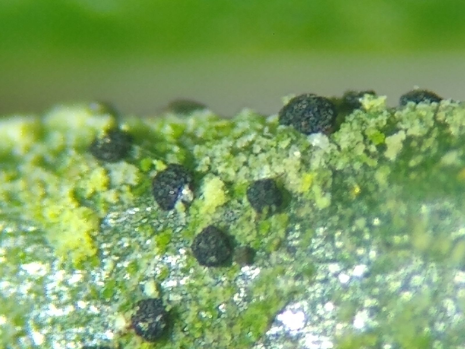 Bild 4 Erstmal nichts Spektakuläres unter der Lupe, dann ein erstes, winziges, schwarzes Apothecium mit gelb-grünem Thallus!