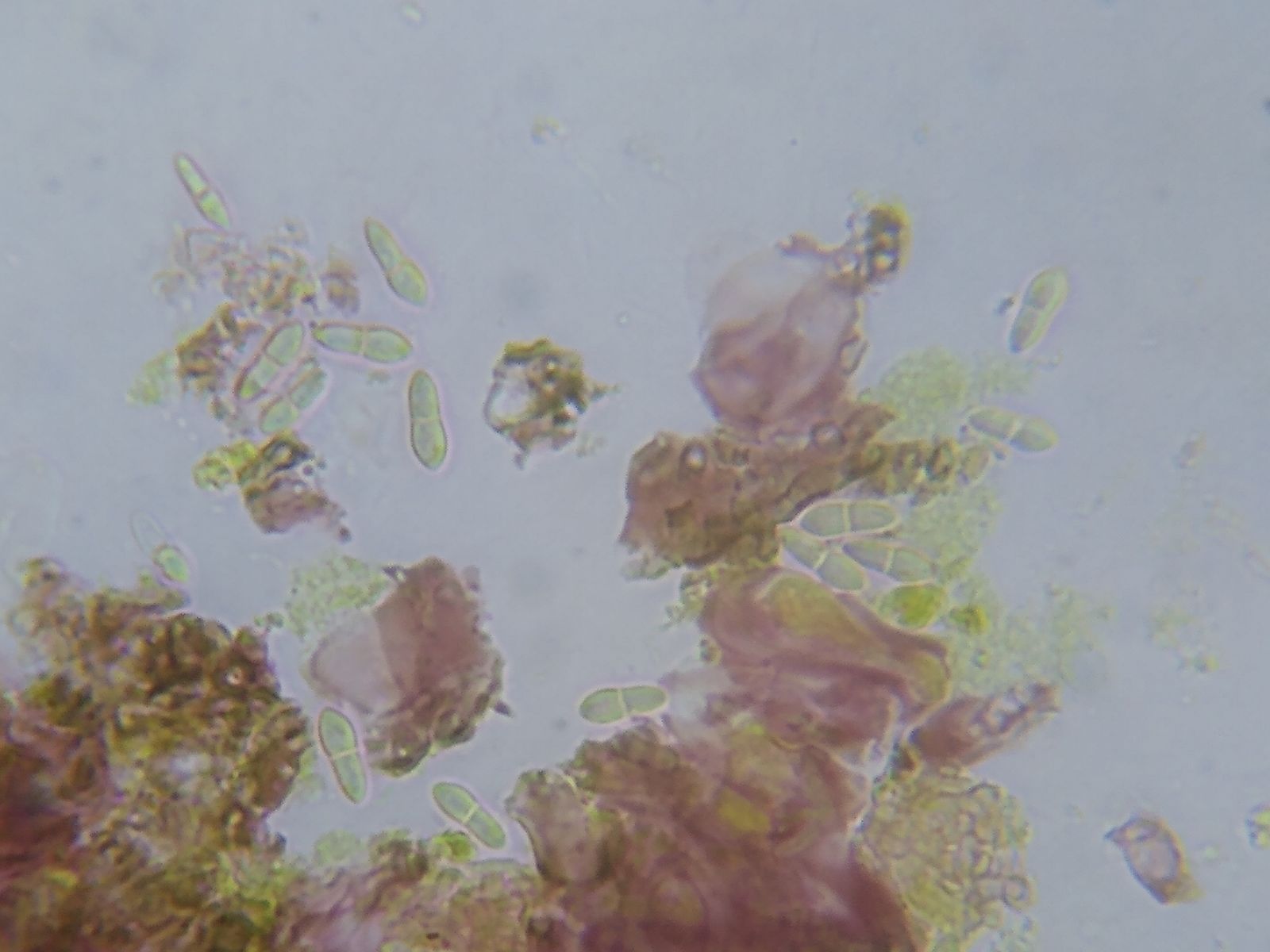 Die Sporen sind sohlenförmig (birnenförmig?), d.h. eine Zelle etwas größer und rundlicher als die zweite Zelle, die schlanker und länglicher ist.