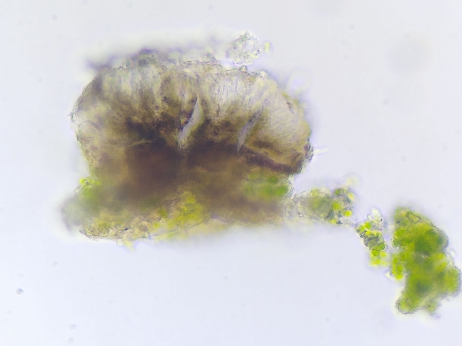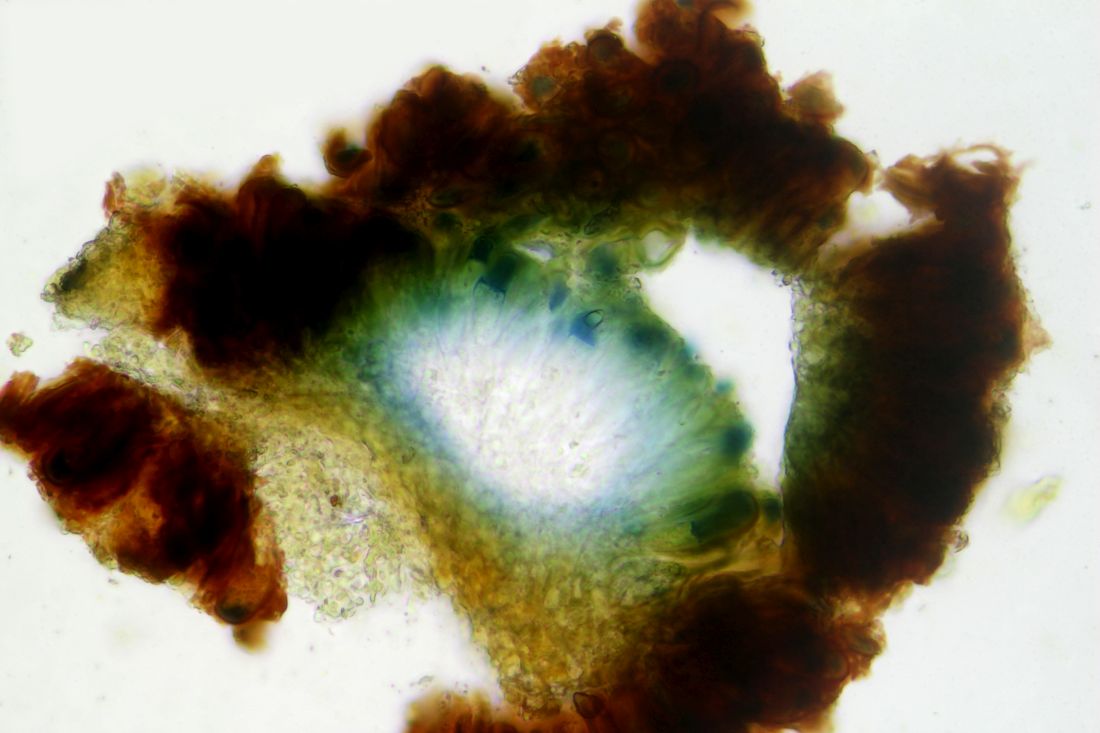 Bild 10 Gequetscht in Wasser zeigt sich ein braunes Hypothecium und ein bläuliches bis bräunlich schimmerndes Epihymenium.