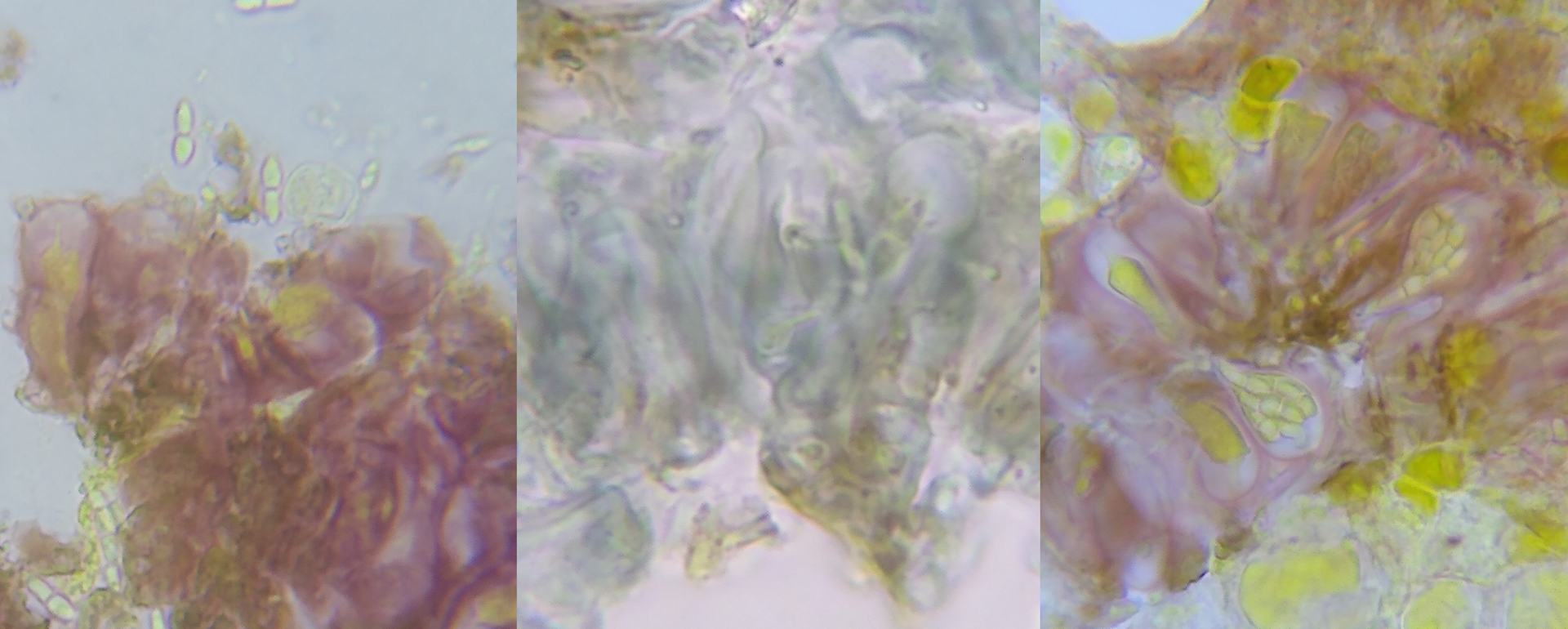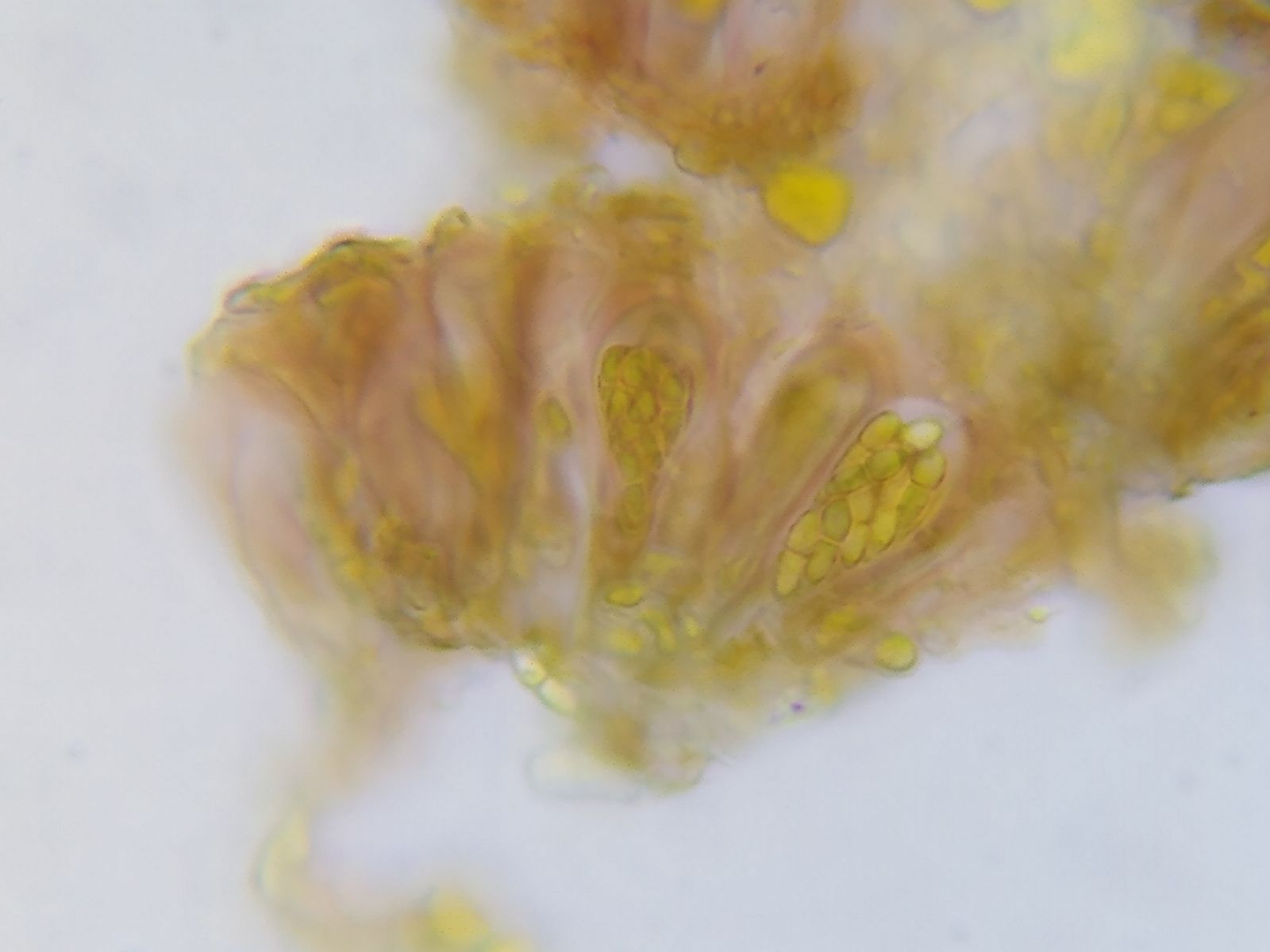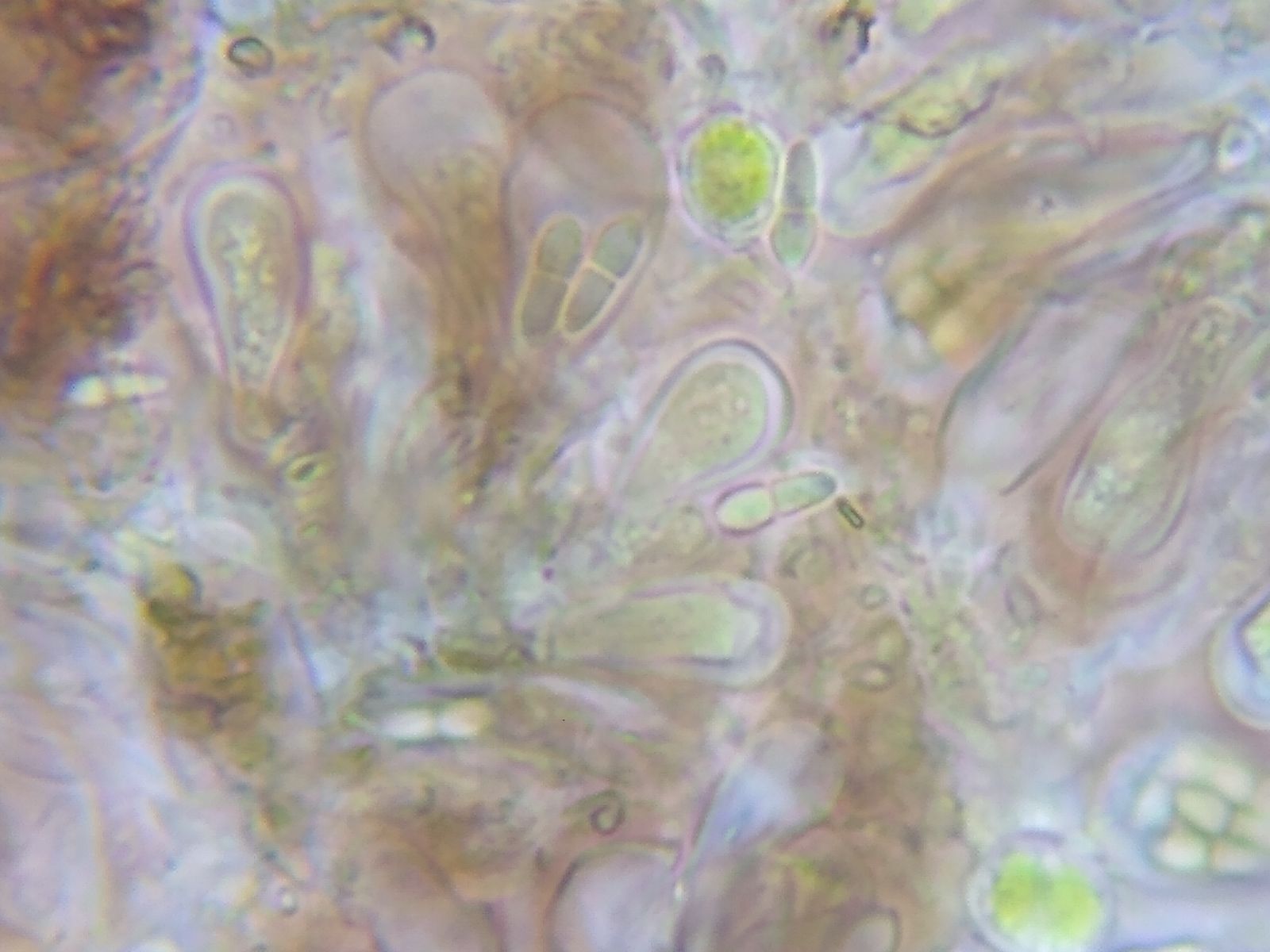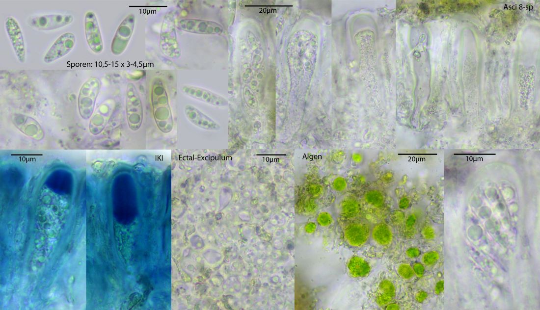 Dazwischen ein farbloses Hymenium mit dicken, keuligen Asci (um 20 x 10 µm).