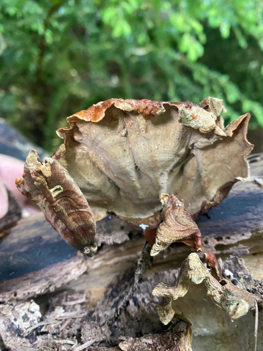 Stereum insignitum (Braunsamtiger Schichtpilz, Prächtiger Schichtpilz) – Fundkorb