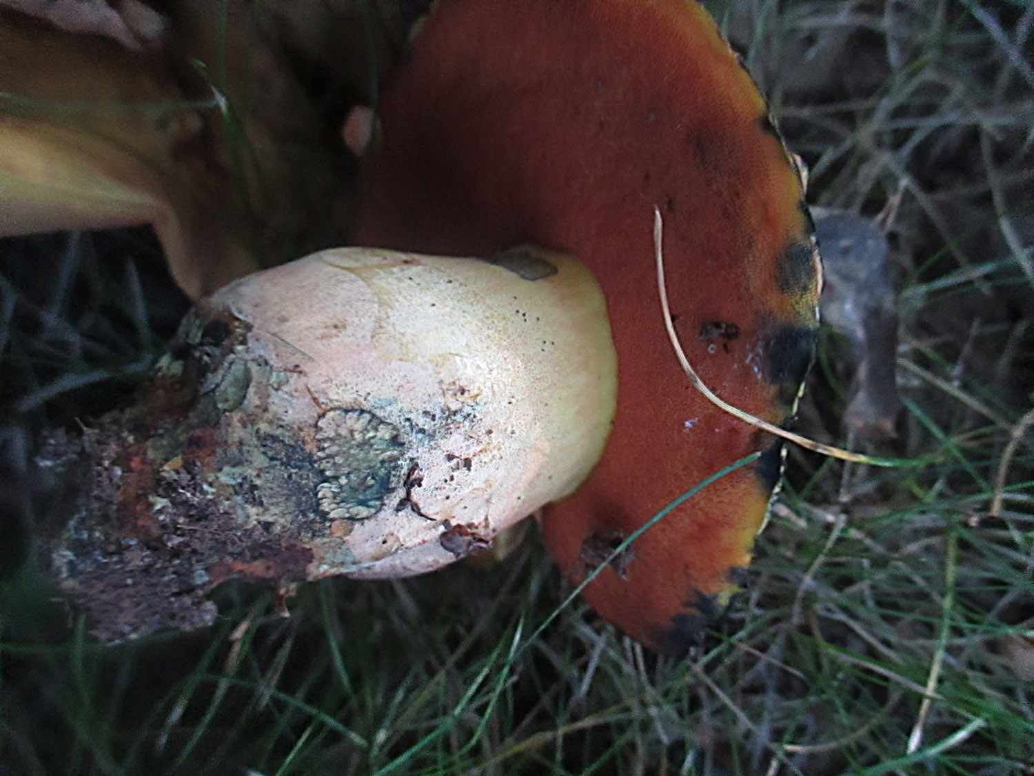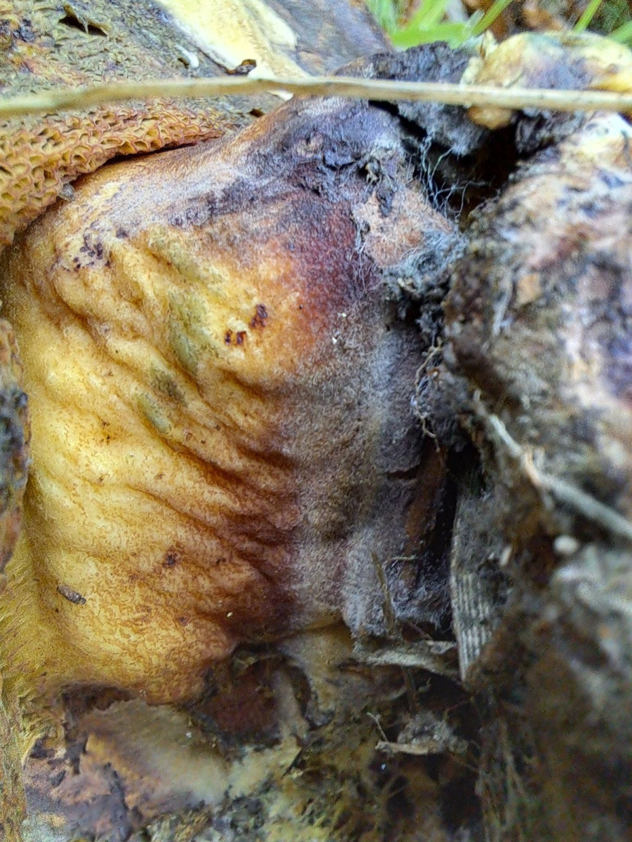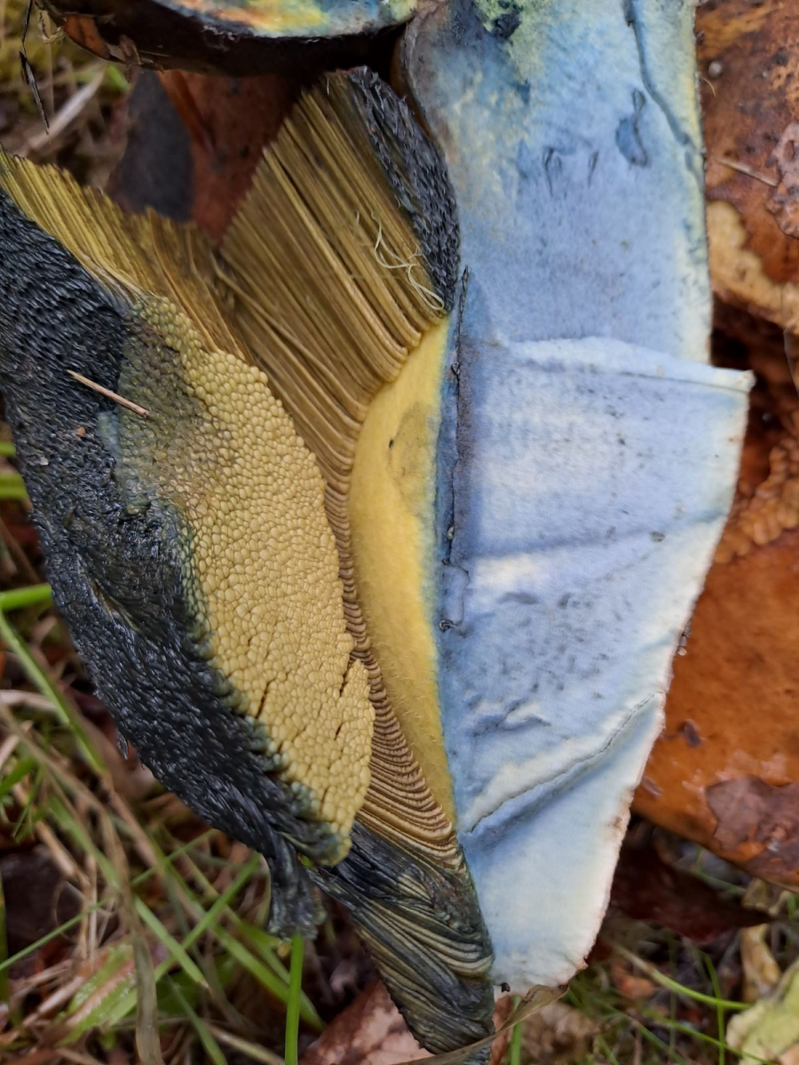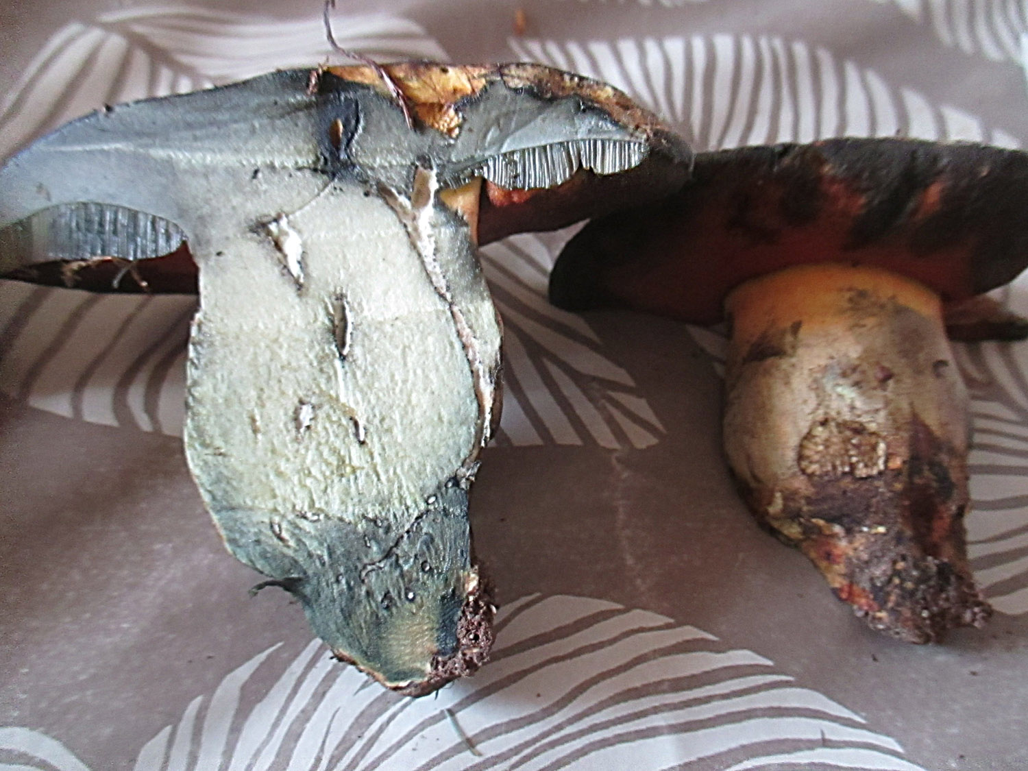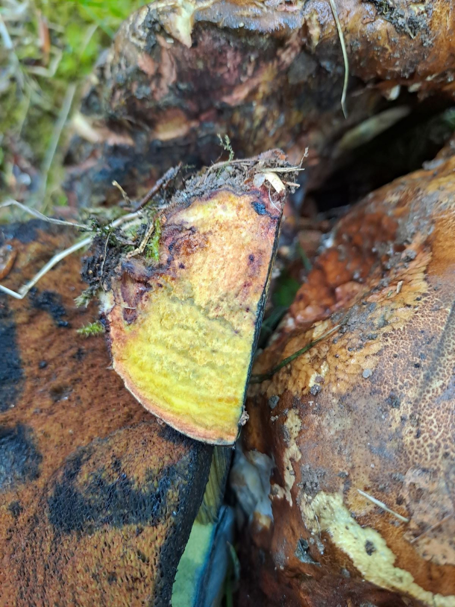 Der Schnitt ist weicher, als man es z.B. von einem Flockenstieligen Hexenröhrling erwarten würde. Die Fruchtkörper sind aber auch schon älter, teilweise angeschimmelt.