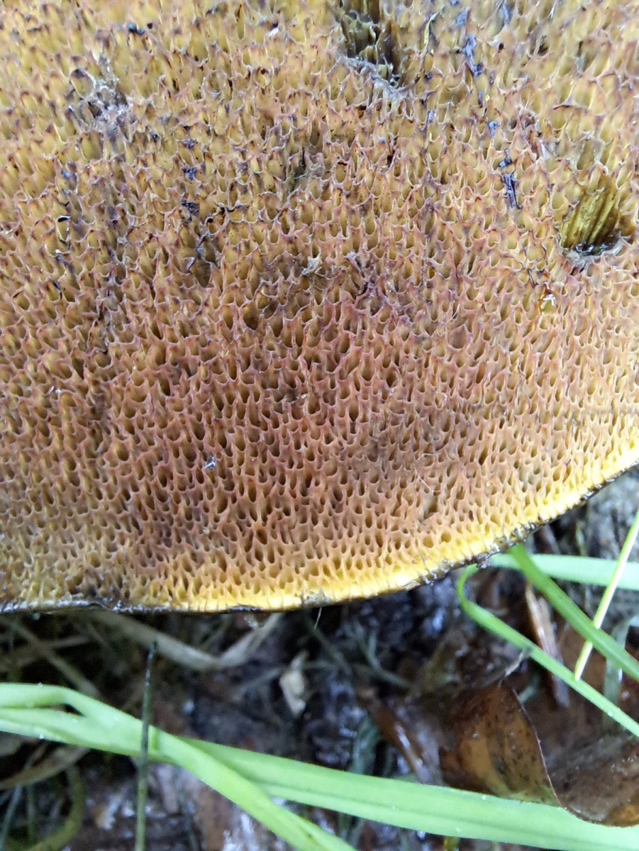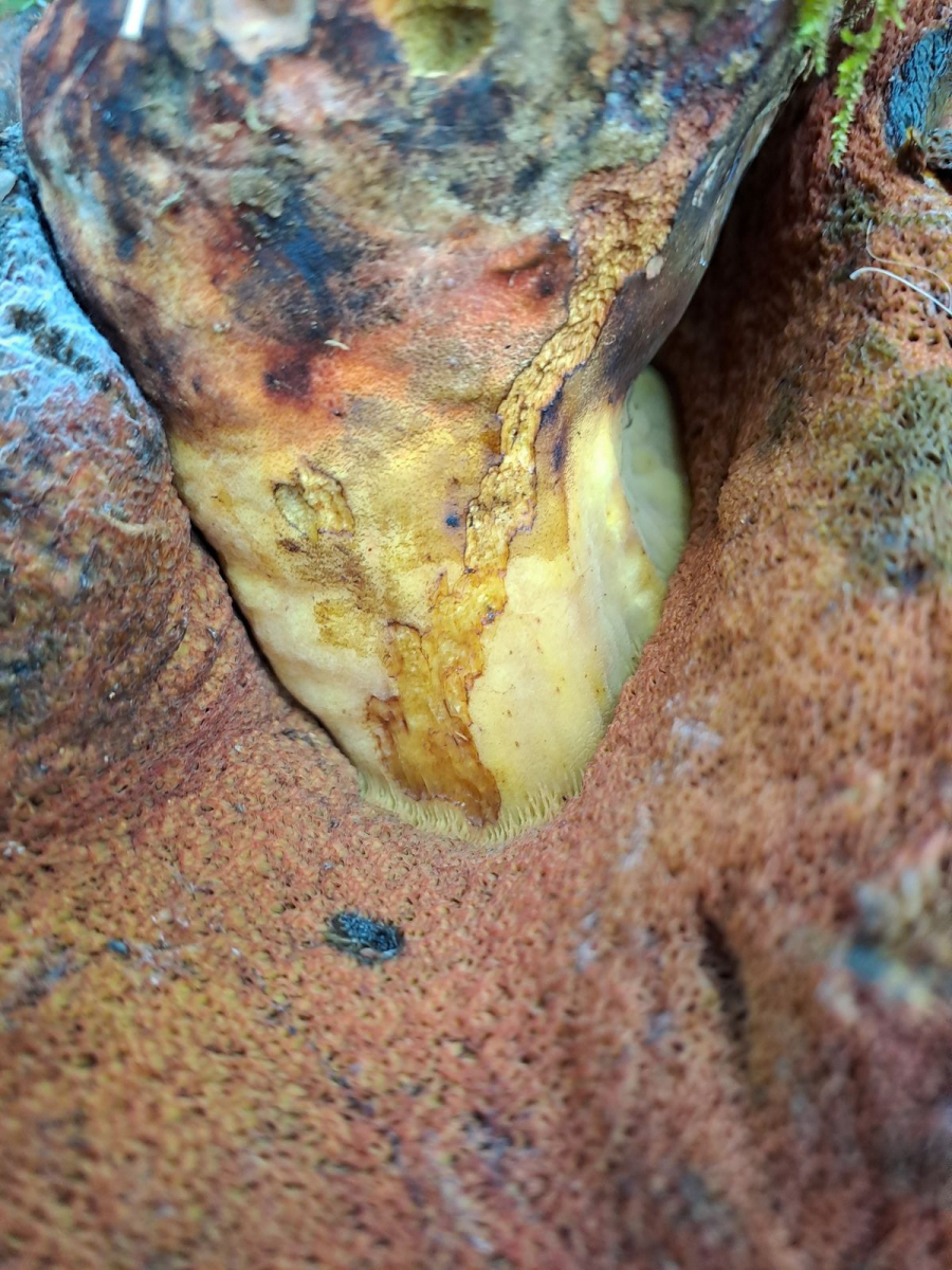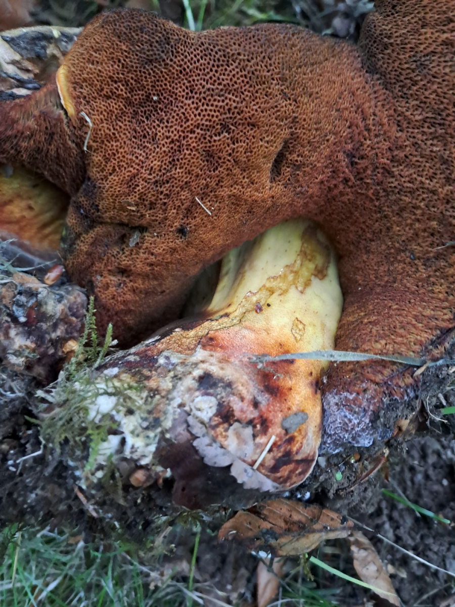 Der Schnitt ist weicher, als man es z.B. von einem Flockenstieligen Hexenröhrling erwarten würde. Die Fruchtkörper sind aber auch schon älter, teilweise angeschimmelt.
