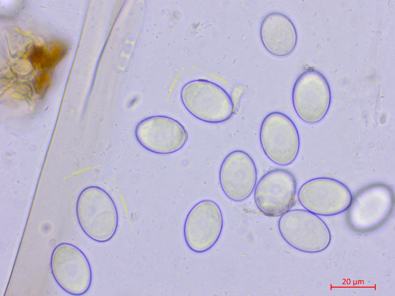 Nebst den kleinen Fruchtkörpern sind die grossen, glatten Sporen typisch für die Art.