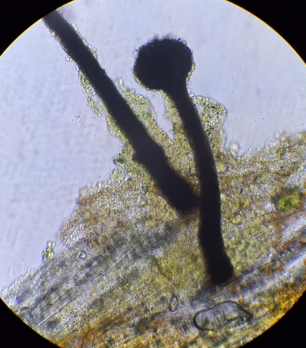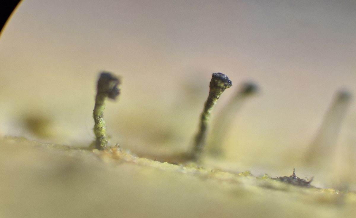 Geschlüsselt komme ich zu Mycocalicium subtile, weil da die Länge der Asci gefragt wird. Zweifellos passt die Länge der Asci ganz gut. Selbst die Sporengröße wäre kein Ausschlusskriterium. Eher das Gesamterscheinungsbild. M. subtile hatte ich mittlerweile reichlich unterm Glas und die ist nicht so filigran und das Köpfchen viel breiter ausladend, und im Substrat sollten keine Algen sein. Ich schließe nicht aus, dass es sich nicht doch als extremistische M. subtile herausstellen kann, gehe aber eher davon aus, dass das eine der Chaenothecopsis-Arten ist, die in dem Schlüssel nicht enthalten ist (flechten-deutschland listet über 20 Arten).