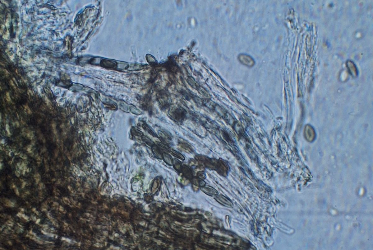 In Wasser: Asci einigermaßen gut zu sehen, teils unreif, etwa 40-45*4 µm; Sporen braun, 5-7 (10)*2,5-3,5, die Stielstruktur reicht bis ins Köpchen