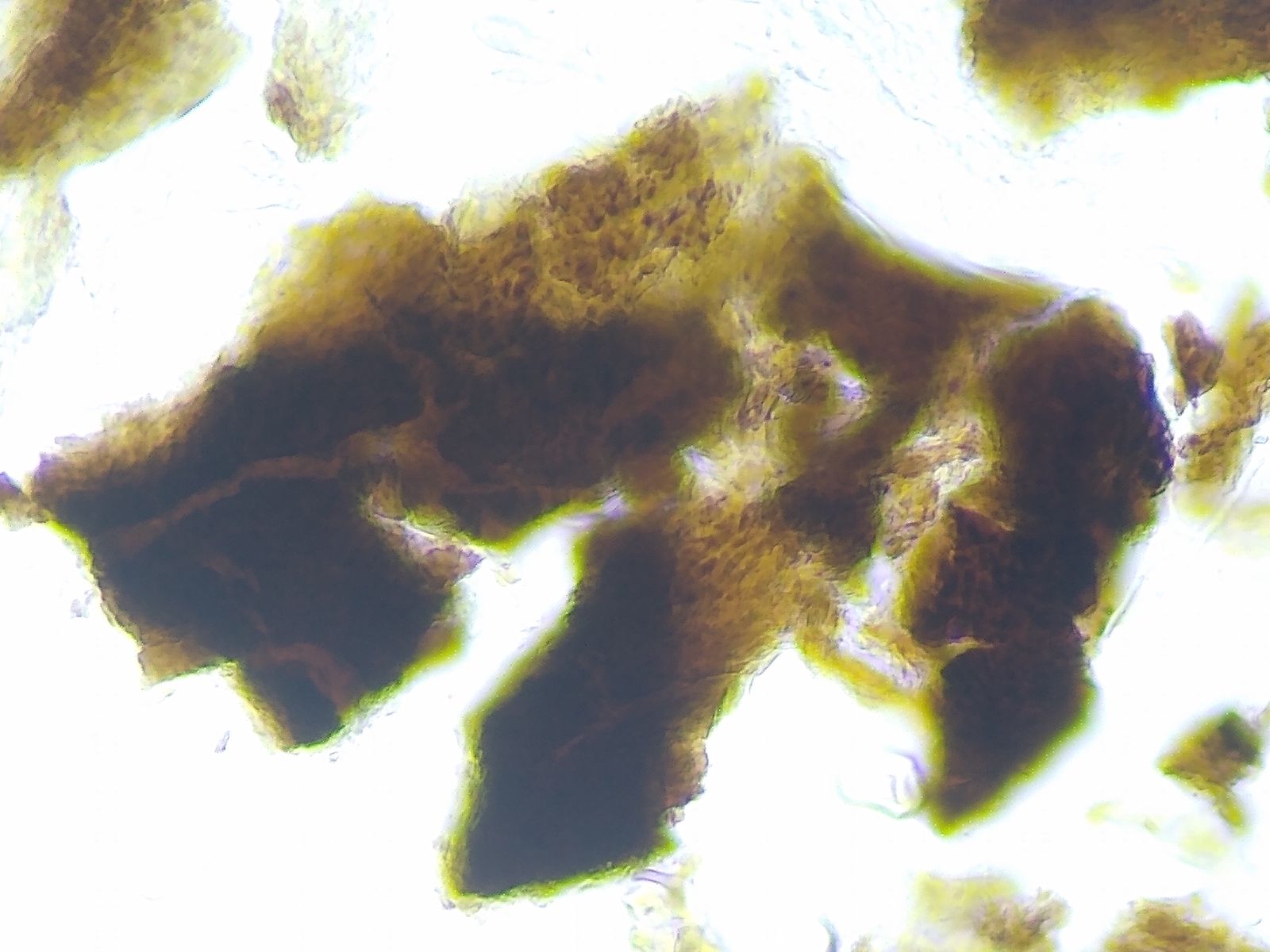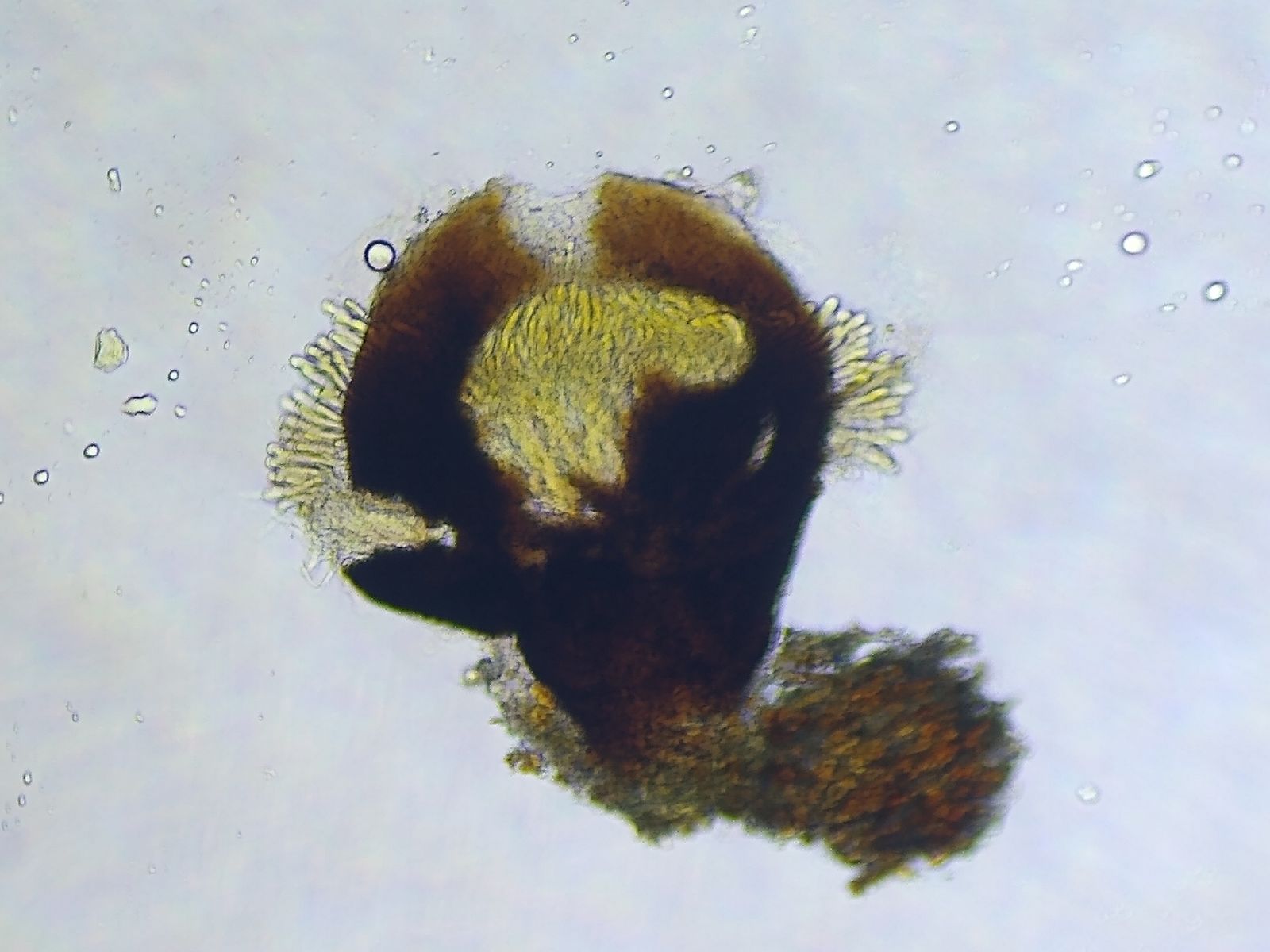 Bild 6 Gequetscher Fruchtkörper in Wasser mit Lugolzusatz, der Asci freisetzt.