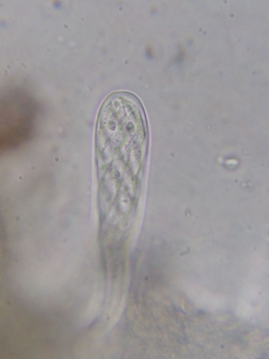 Eine Quetschprobe von einem geschlossenen Fruchtkörper zeigt schlanke, keulige Asci mit Haken und einige wenige frei schwimmende, noch einzellige, gekrümmte Sporen: