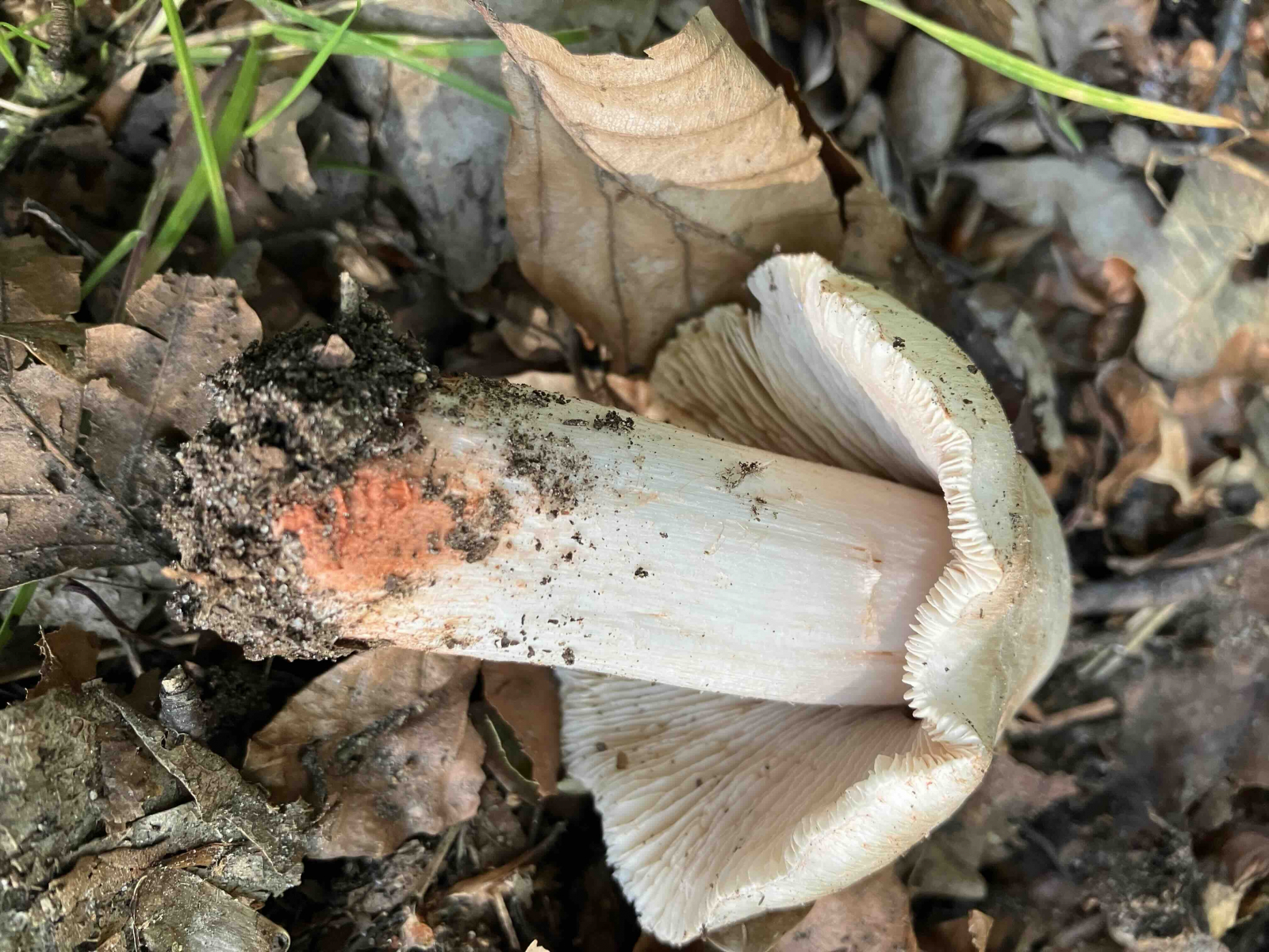 Wir hatten den letztens auch. Uns ist aufgefallen, das man junge frische Exemplare, die einige wenige rote Punkte oder Stellen haben, tatsächlich auch schnell für einen jungen Perlpilz halten kann (der schon seine Flocken verlorenhat). Vor allem, wenn nur der Hut rausschaut!