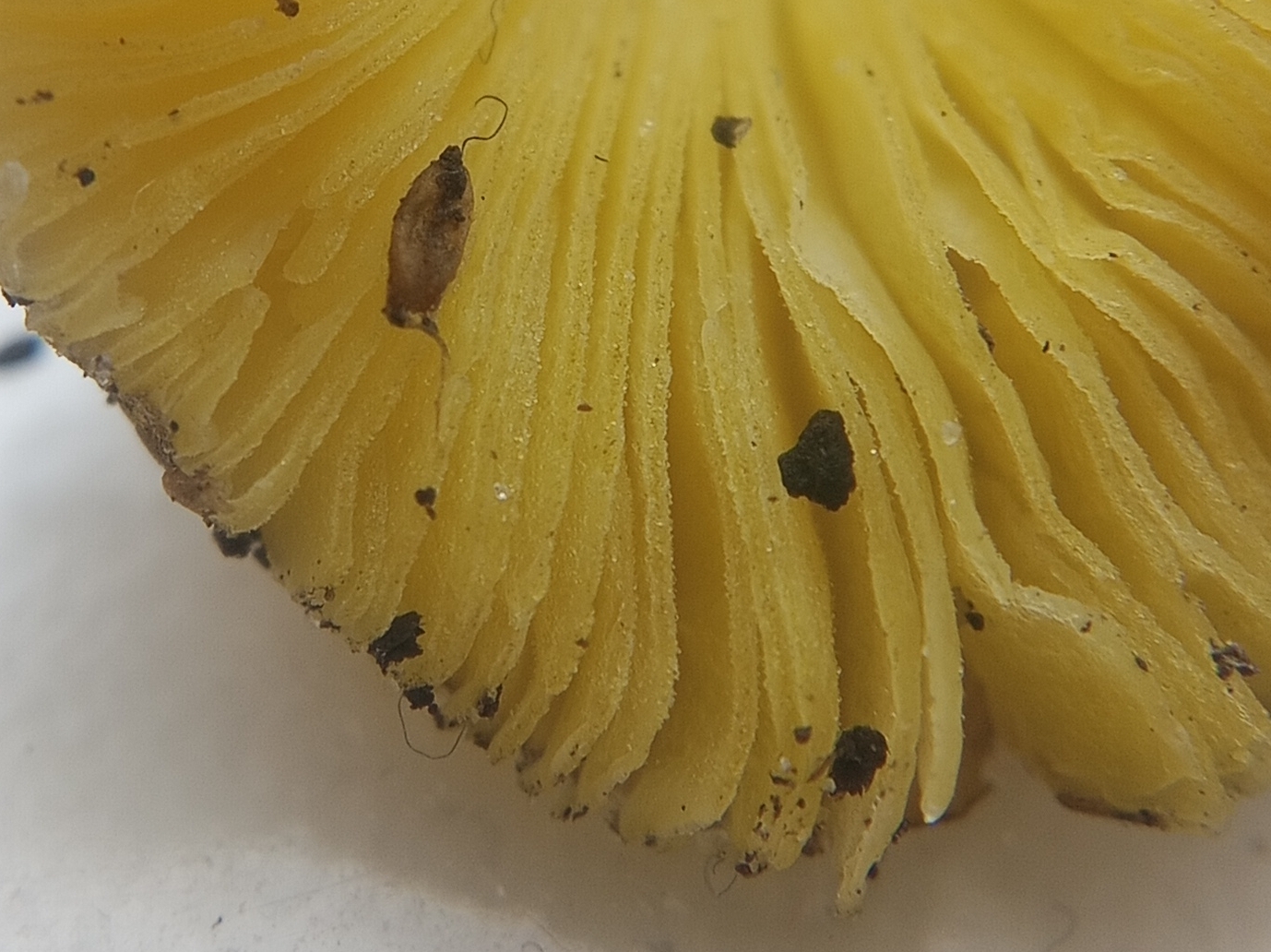 Das könnte hinkommen, auch wegen der bewimperten Lamellenschneiden. Nur, daß die Lamellen so knallgelb sind, schon im jungen Stadium, habe ich noch auf keiner Abbildung dieses Pilzes gesehen. Da ich ihn aber leider noch nie selbst in der Hand hatte, bin ich gespannt, ob andere hier im Forum den so kennen. Vllt ist er ja sehr variabel in der Färbung.