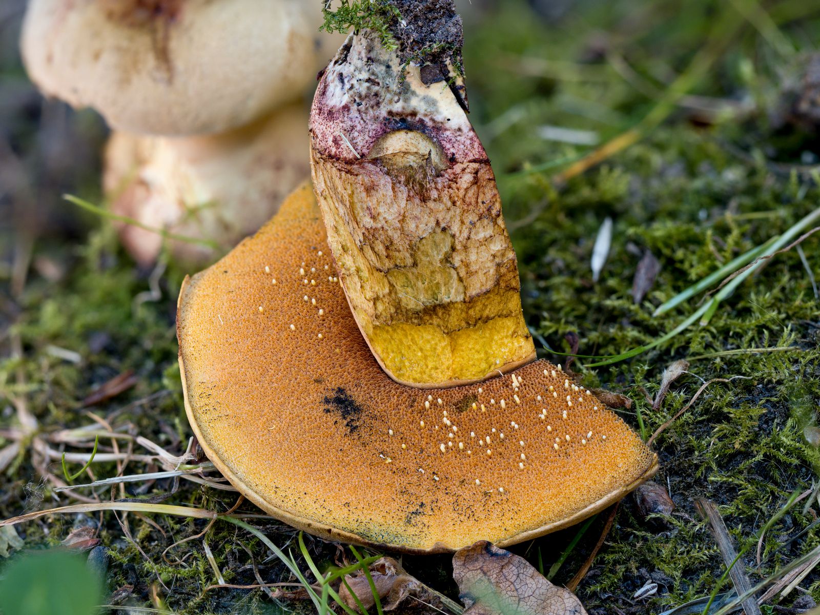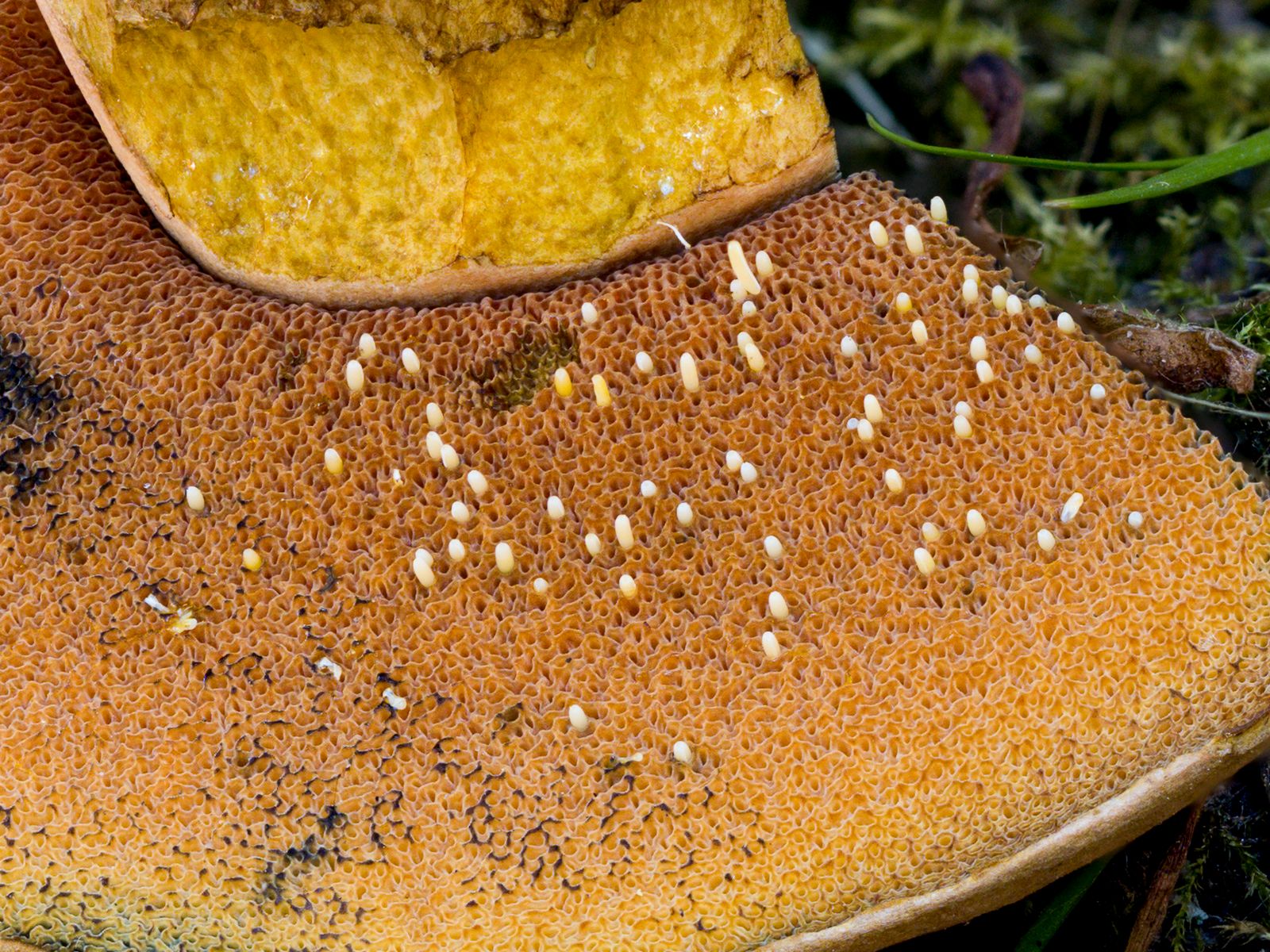 Mir ist heute unter anderem Suillellus queletii über den Weg gelaufen, wobei ein Exemplar aber sonderbare weiße Würstchen in den Poren stecken hatte.