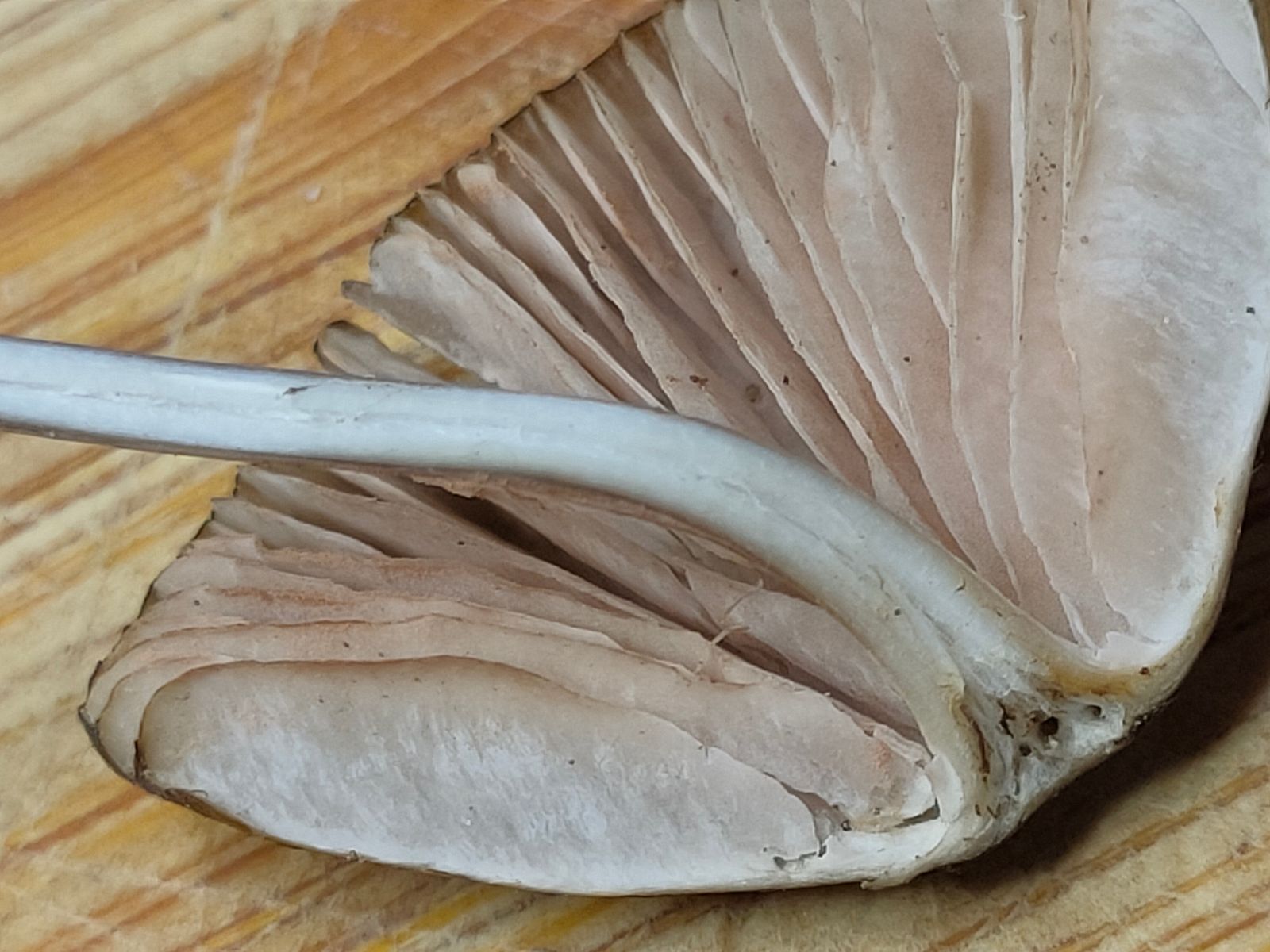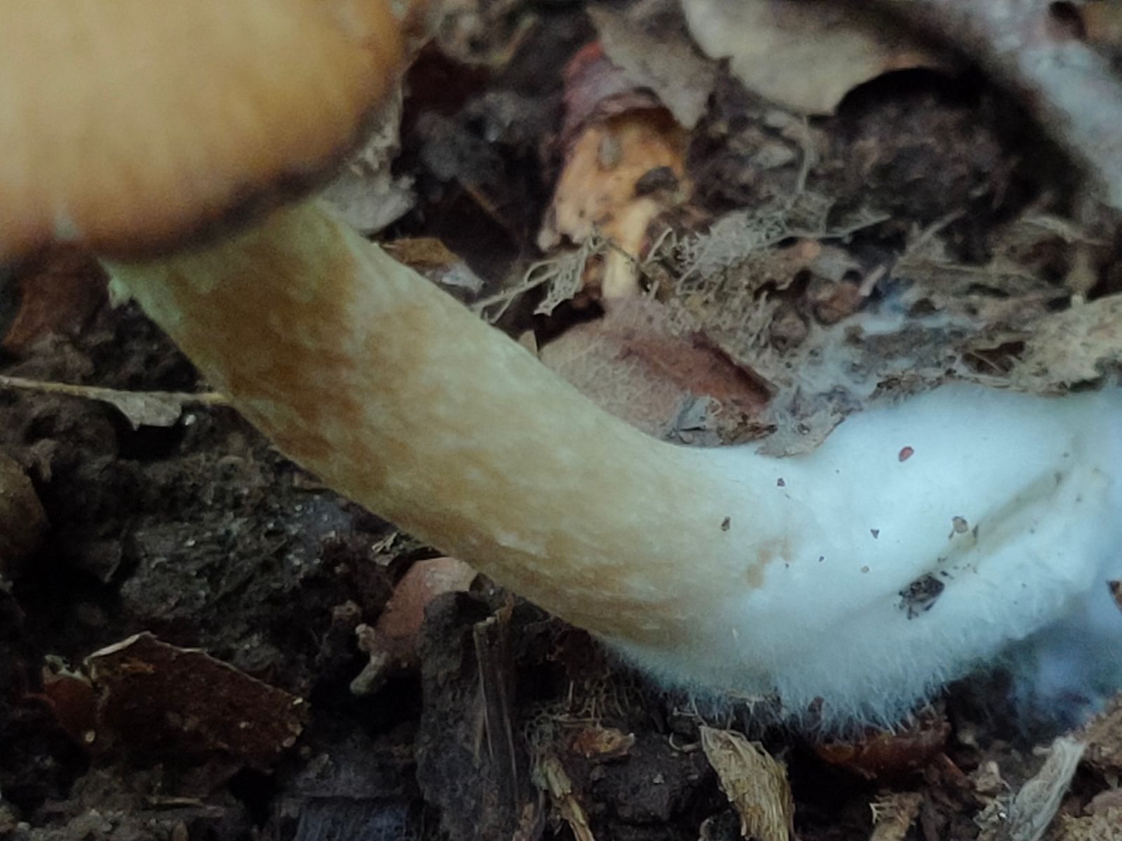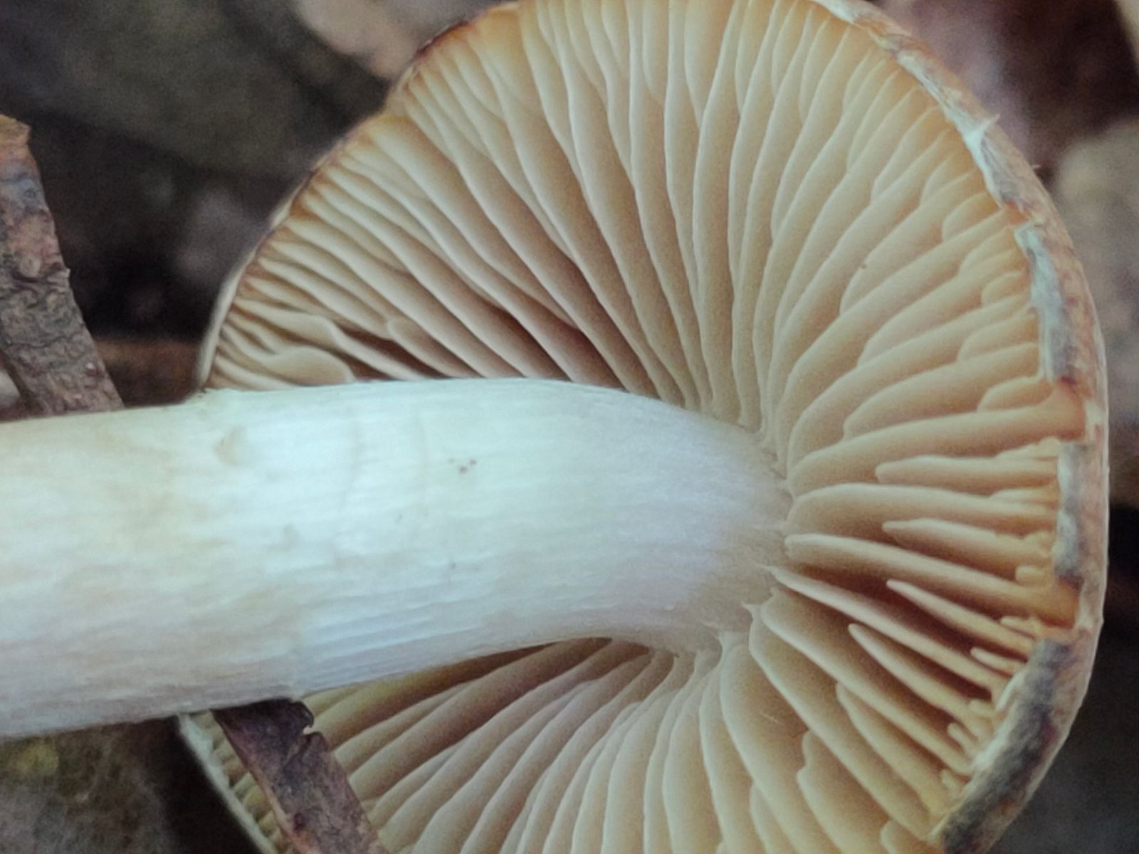 Der Stiel zeigt eine leichte Pseudoringzone. Oberhalb weiss unterhalb leicht genattert hell braun.
