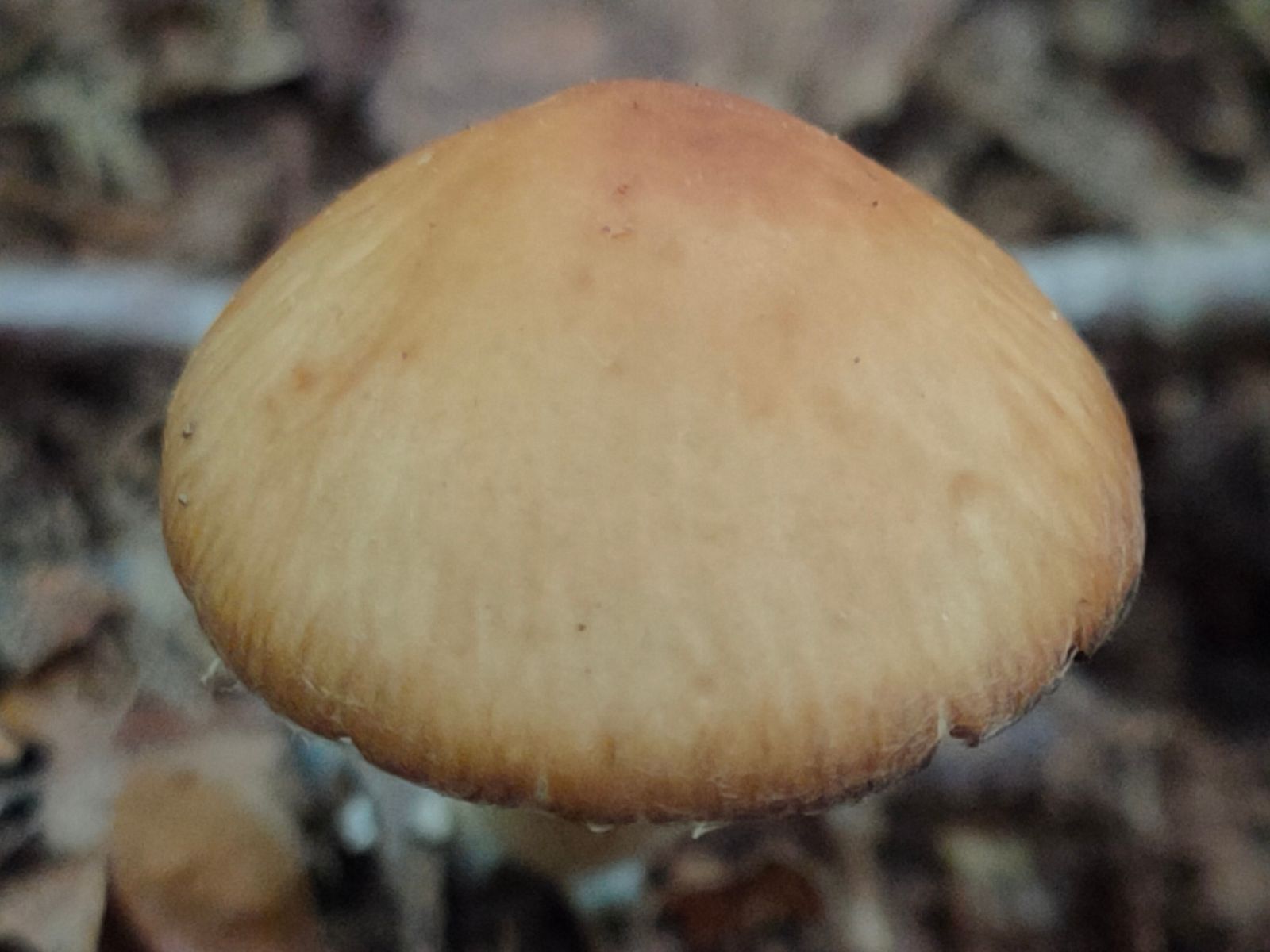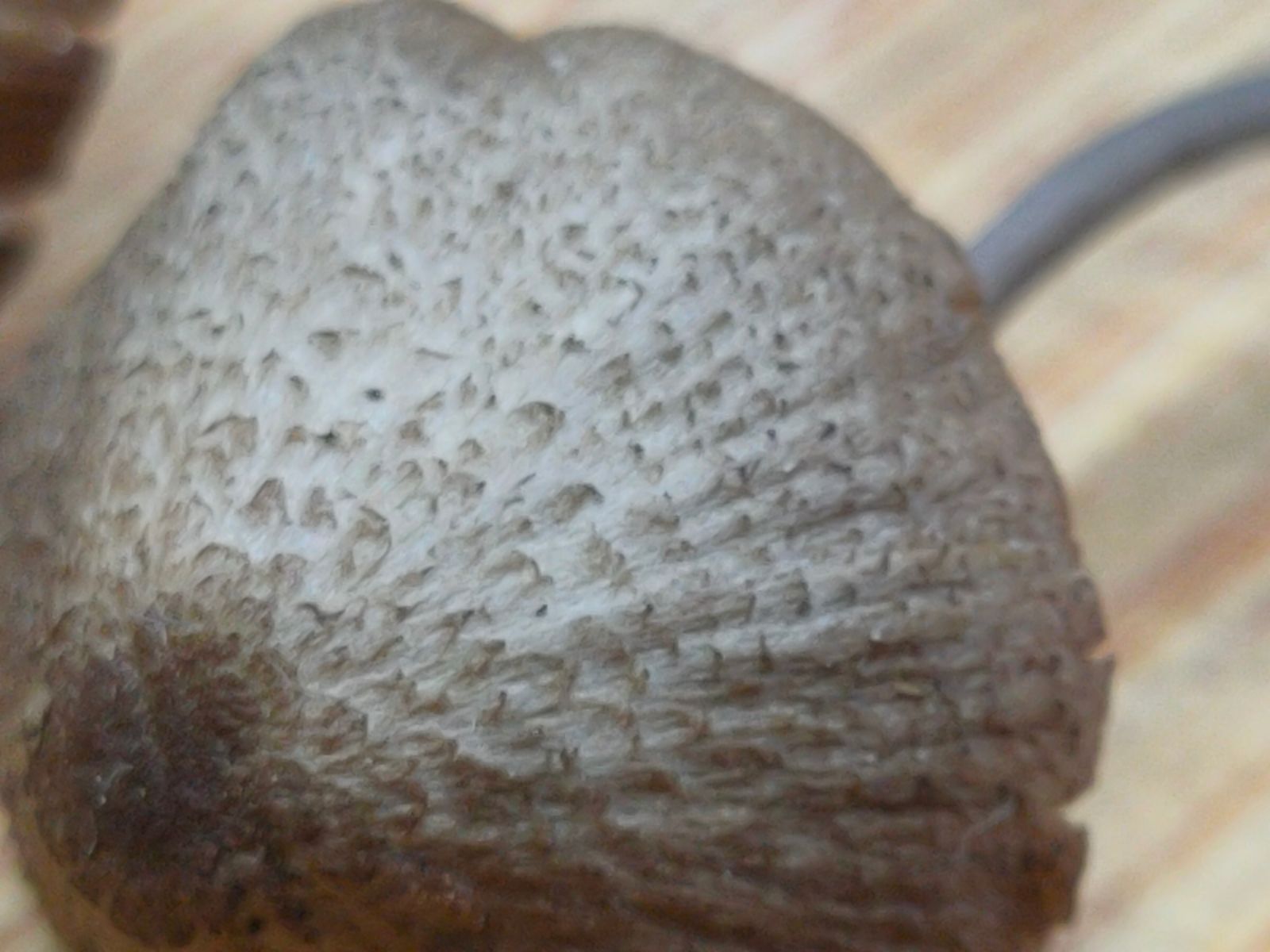 Hut 3 cm, hälftig gerieft, die Mitte dunkler, leicht eingedellt, schwarze Schüppchen auf Grau-braunen Grund.