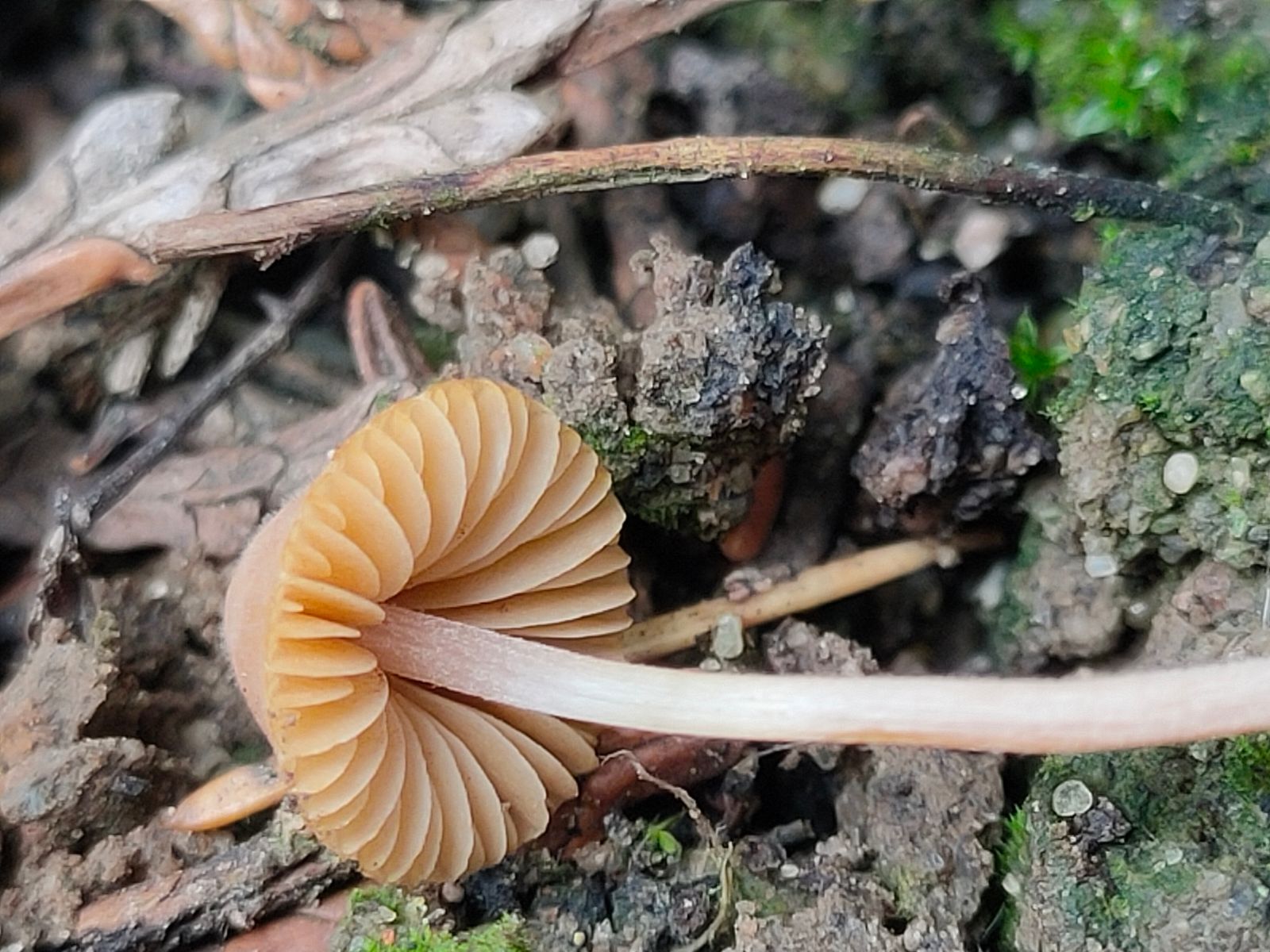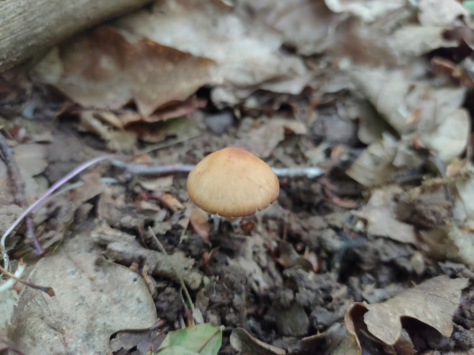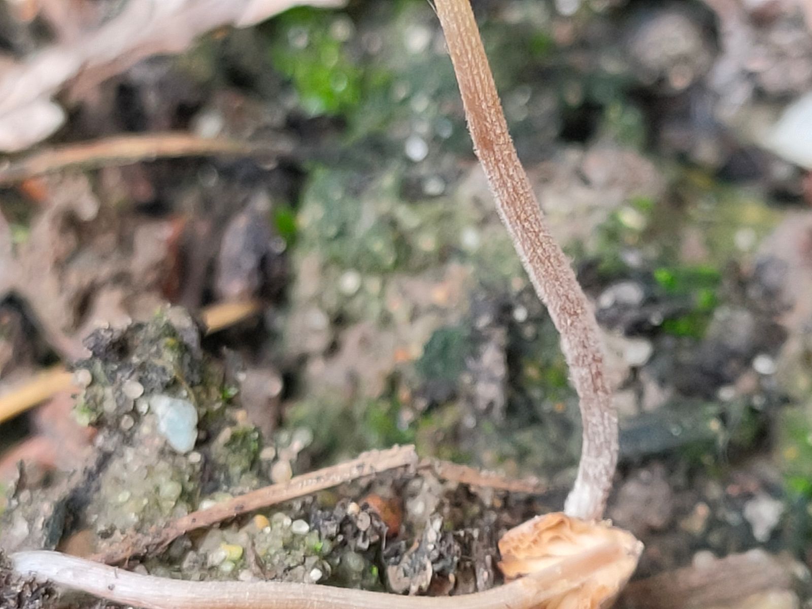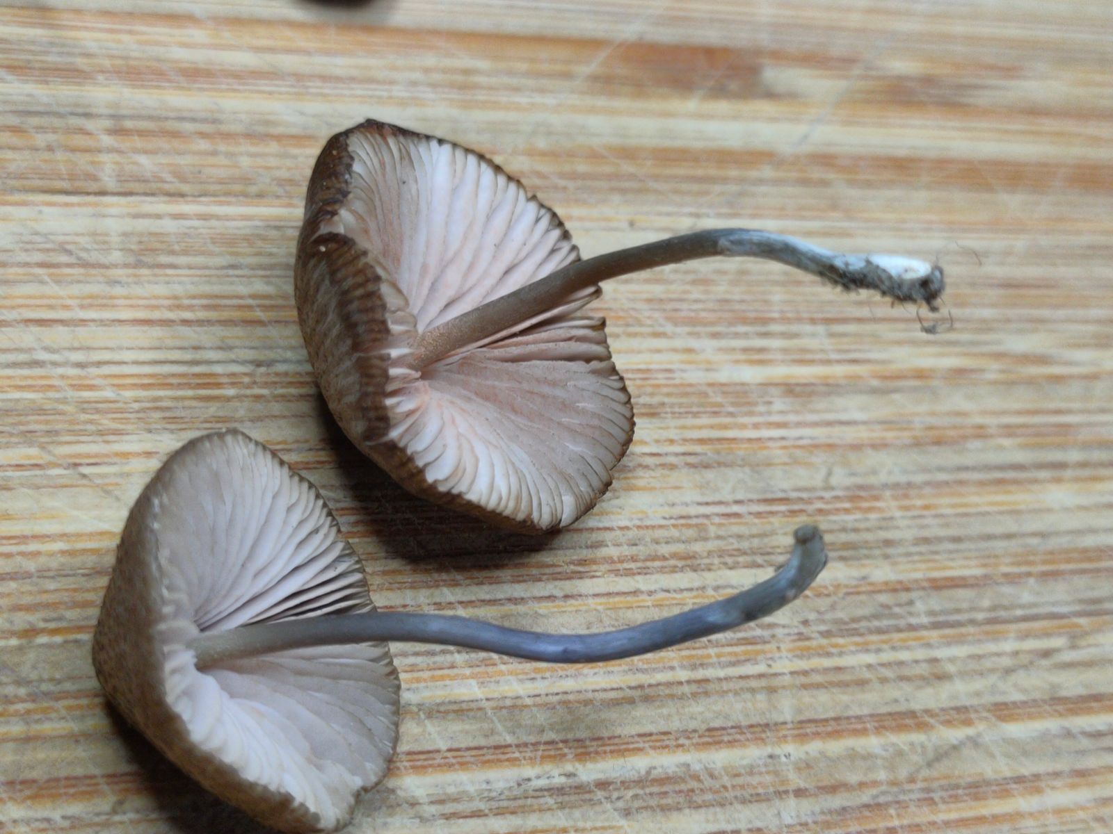 5. Unbekannte Gattung. Dieser 2 cm kleine braune Lamellenpilz mit kräftigem weissen Stiel, schmutzig braunen risspilzartigen Lamellenfarbe entspringt einem kleinem Stück Holz.