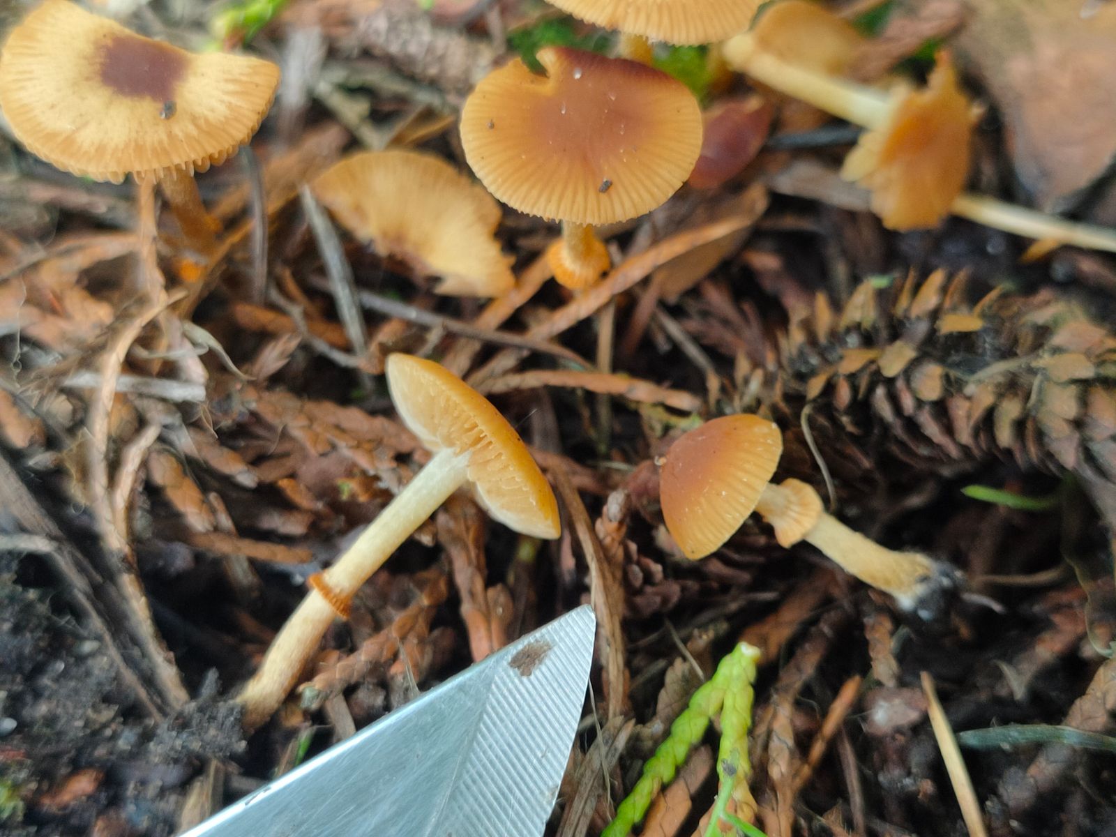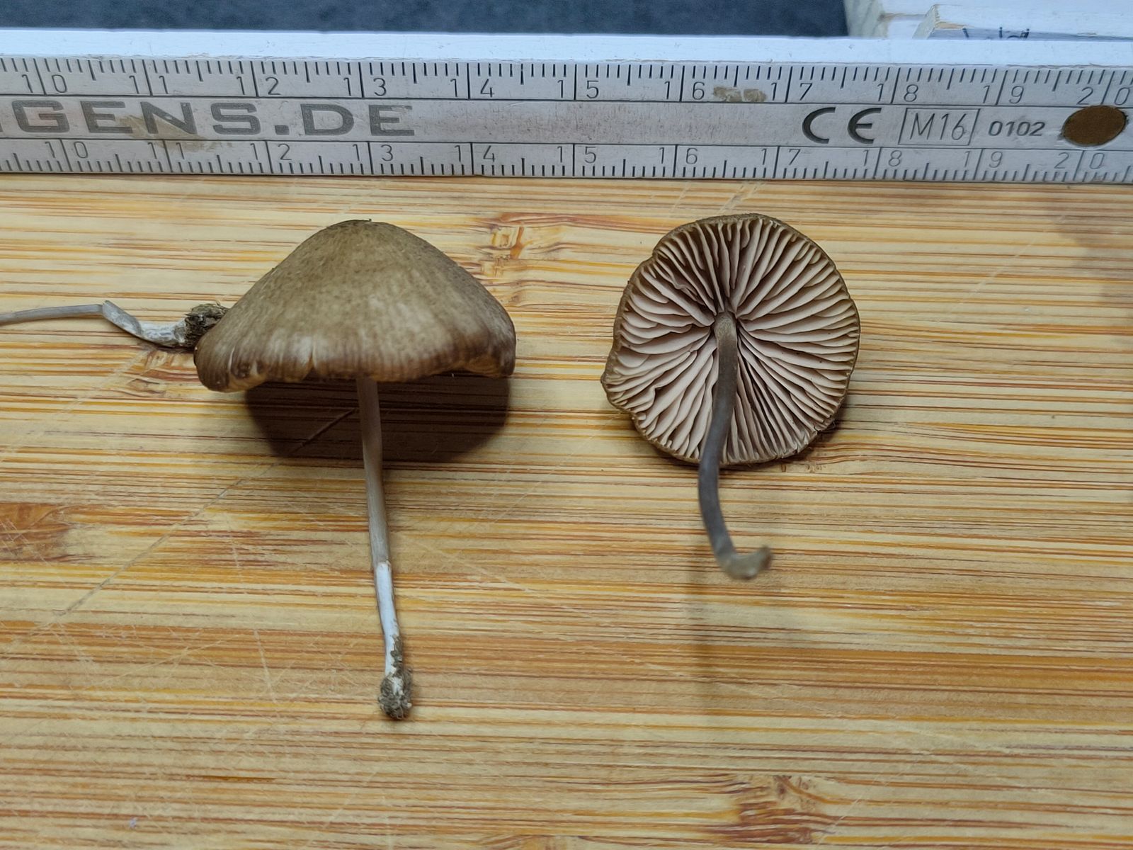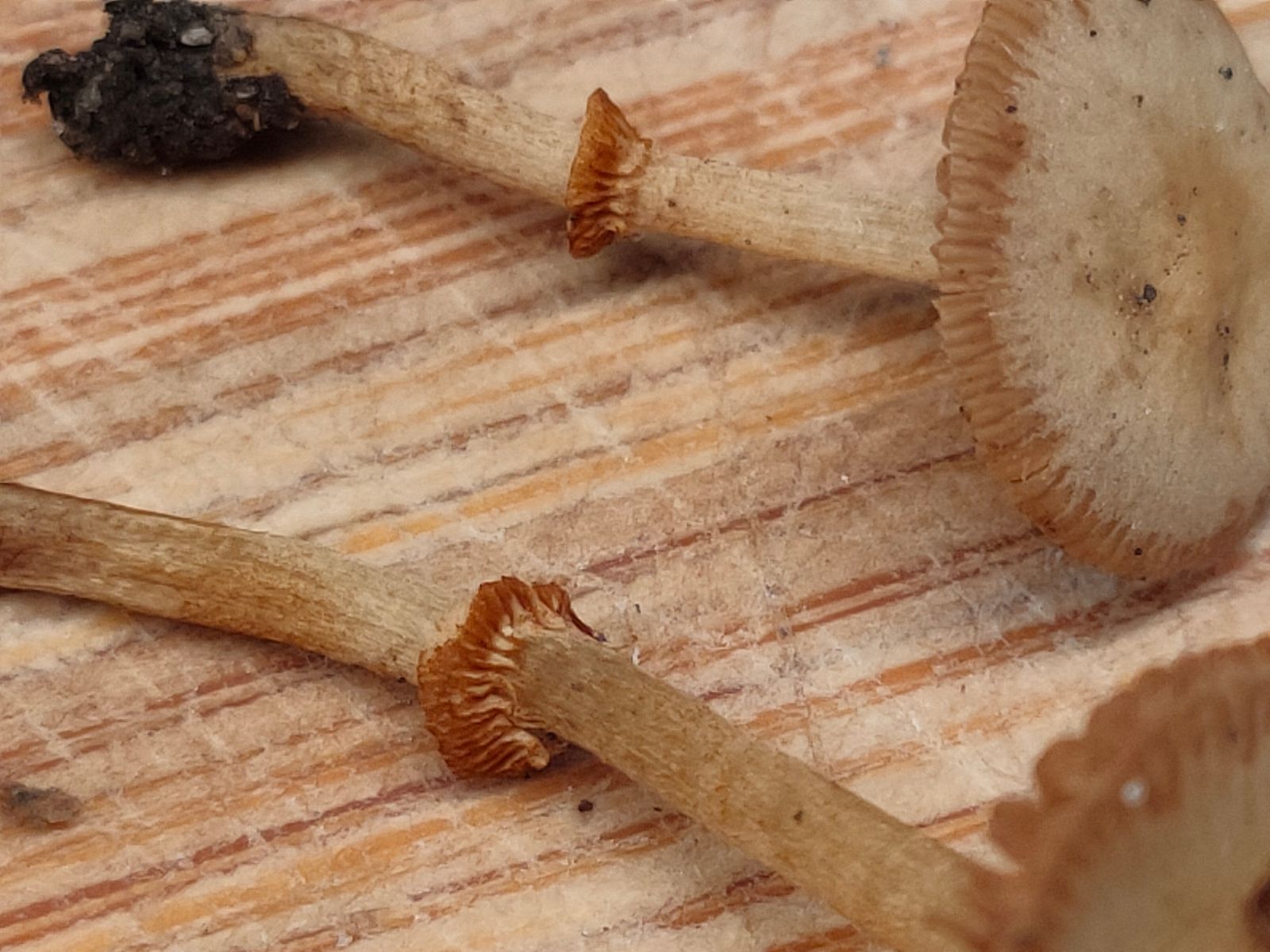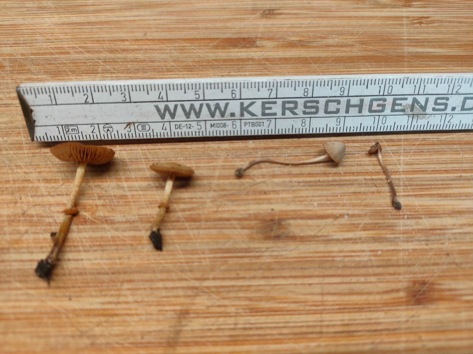 2. Conocybe: In wenigen Metern Entfernung steht auch noch eine beringte Conocybe Gruppe. Hier ist der deutlich oben geriefte Ring und der hygrophane Hut auffällig.