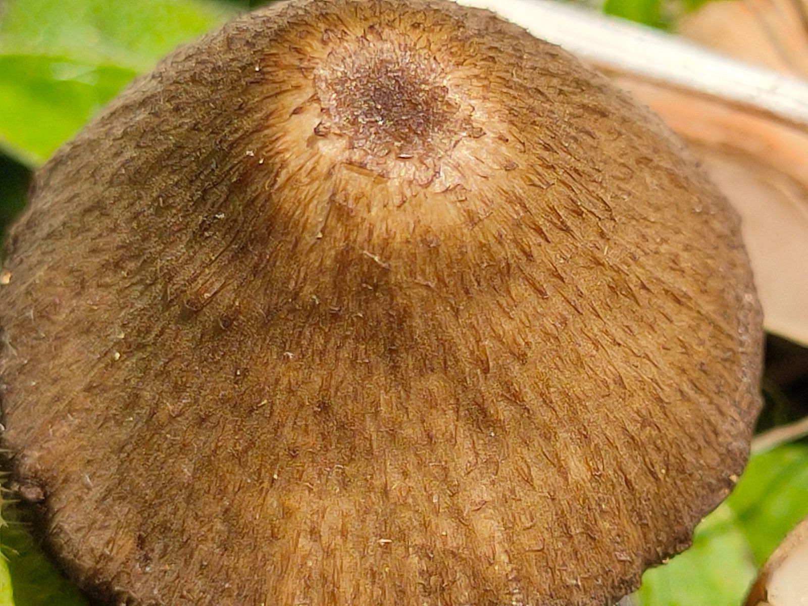 Hut 3 cm, hälftig gerieft, die Mitte dunkler, leicht eingedellt, schwarze Schüppchen auf Grau-braunen Grund.