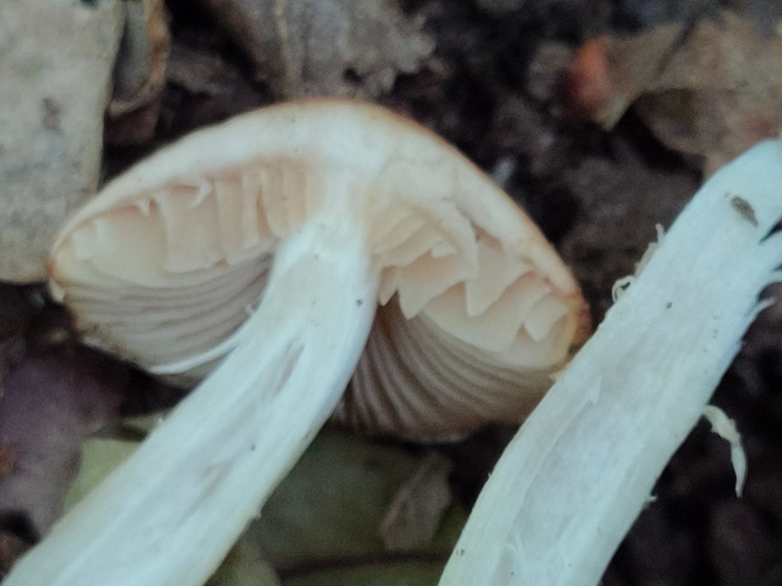 Der Stiel zeigt eine leichte Pseudoringzone. Oberhalb weiss unterhalb leicht genattert hell braun.