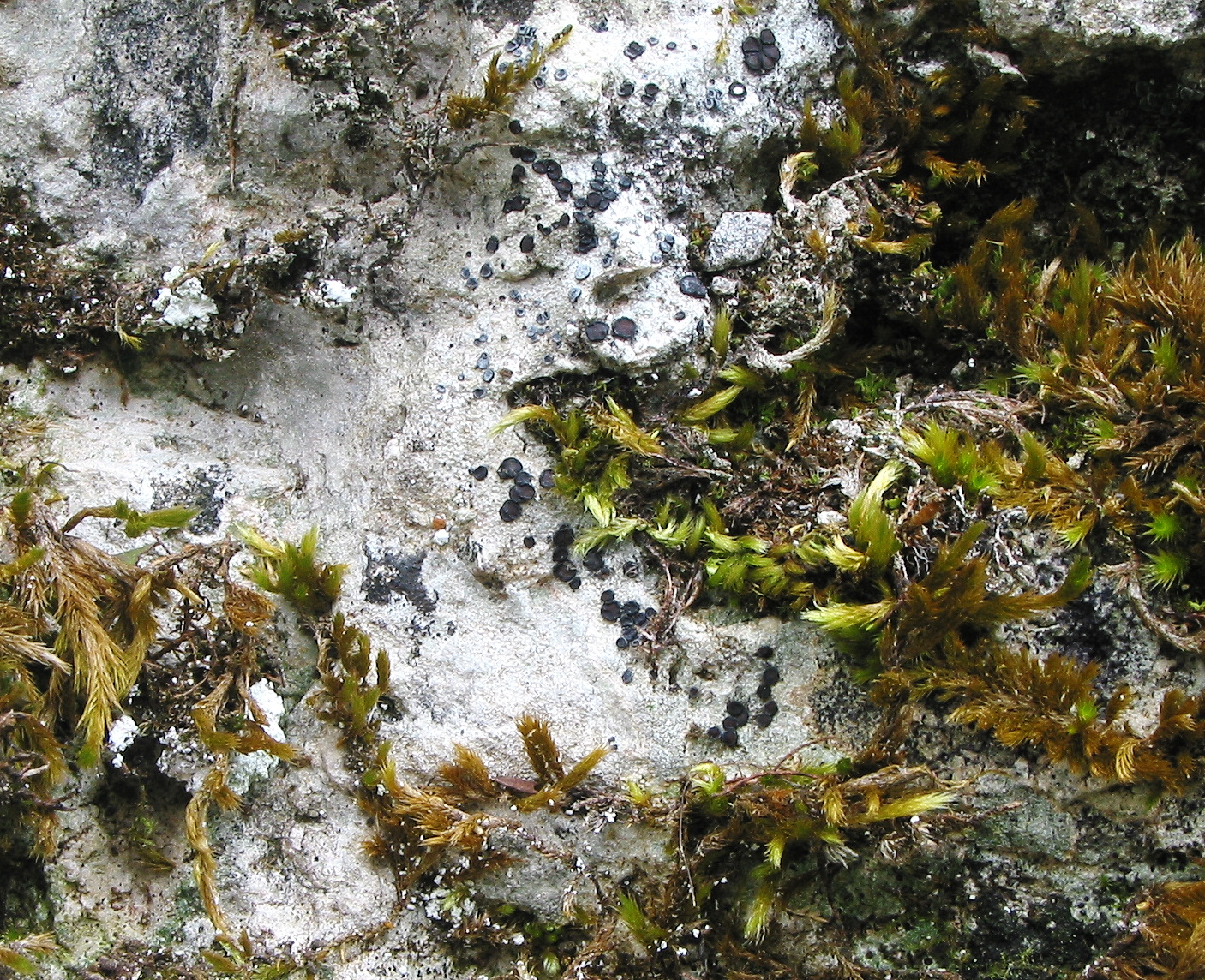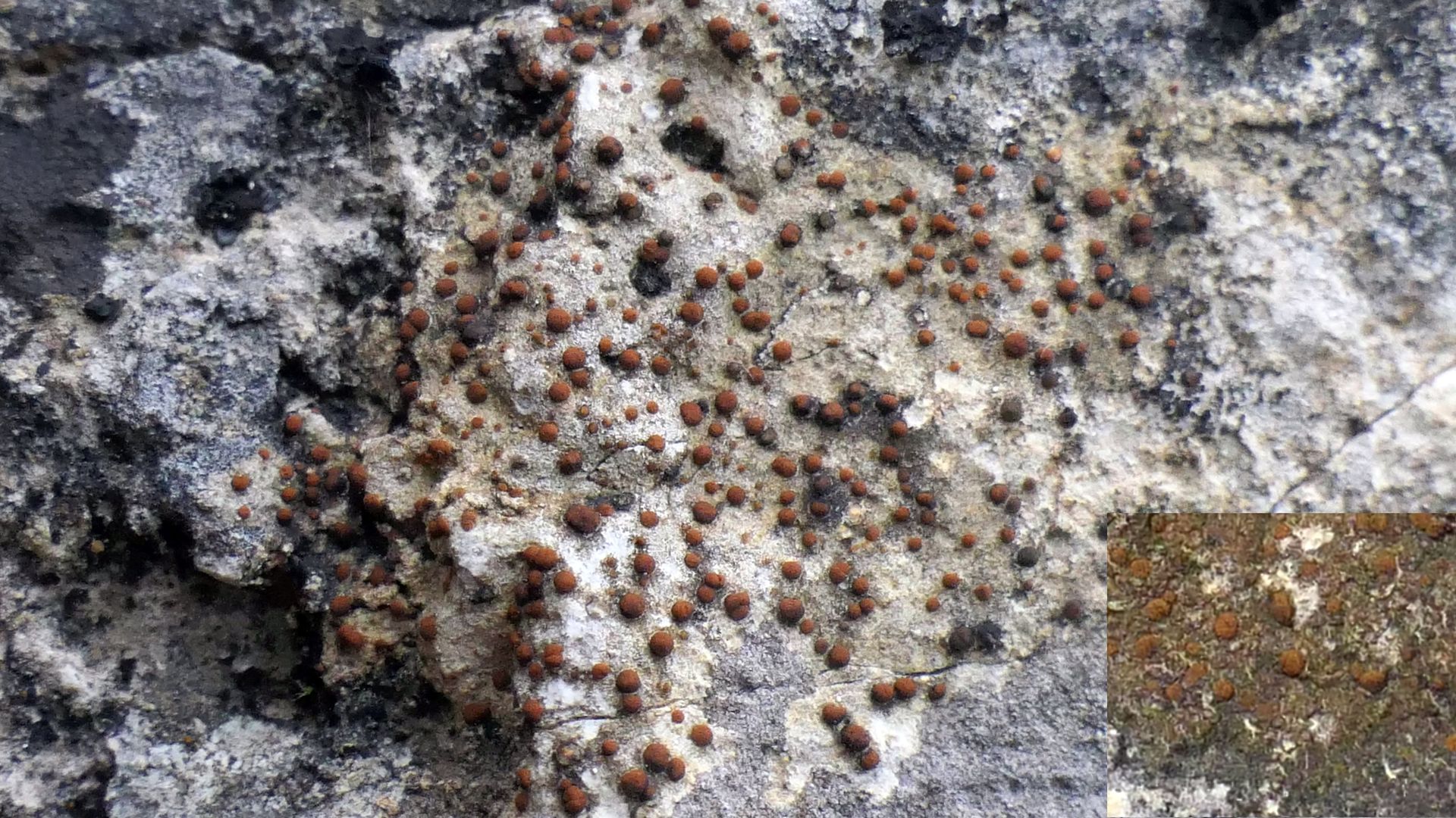 Auffällig ist der dünne, cremefarbene, vermutlich endolithische Thallus, was etwas gegen die häufige P. rupestris (vgl. Bildeinsatz) spräche.