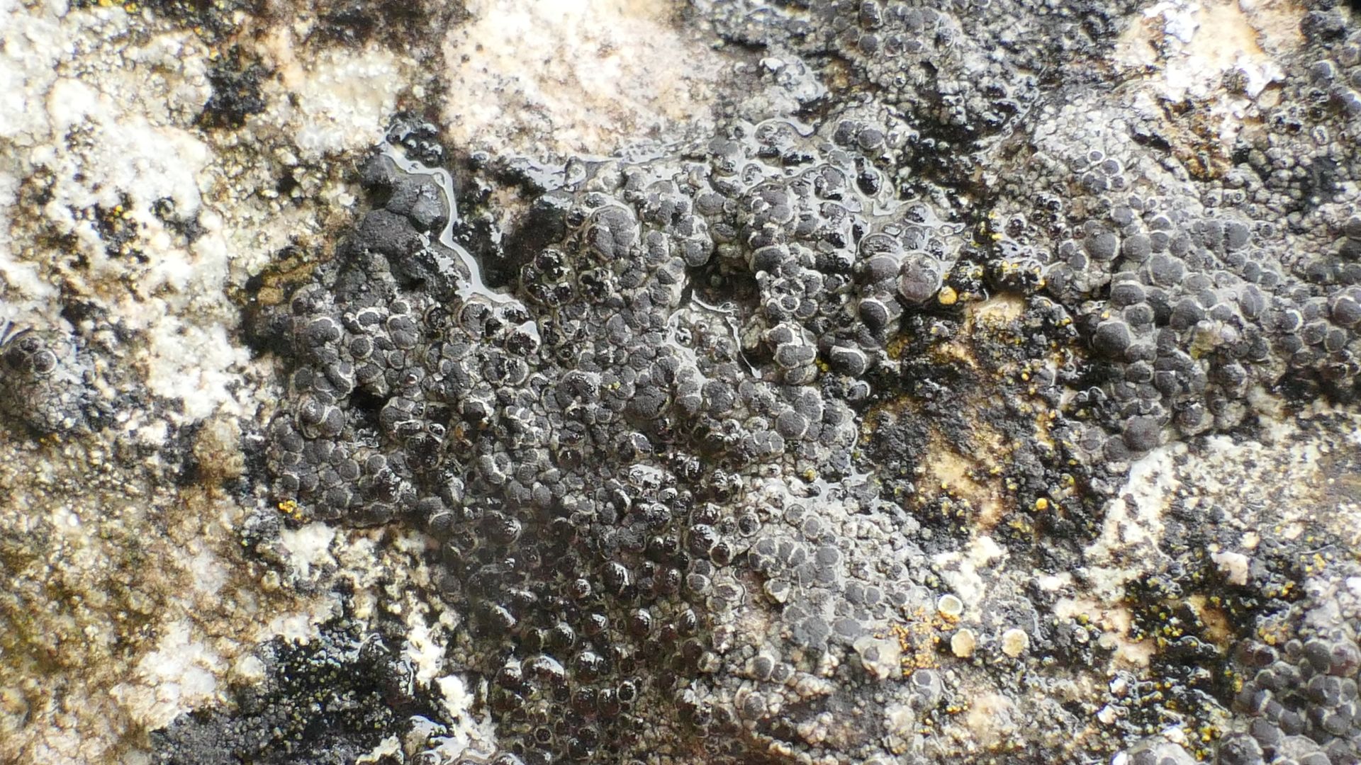 Um die Schwierigkeiten des nassen Wetters zu verdeutlichen, folgt ein Foto einer durchweichten Krustenflechte, die ich ebenfalls der Art Pyrenodesmia chalybaea zuordnen möchte.