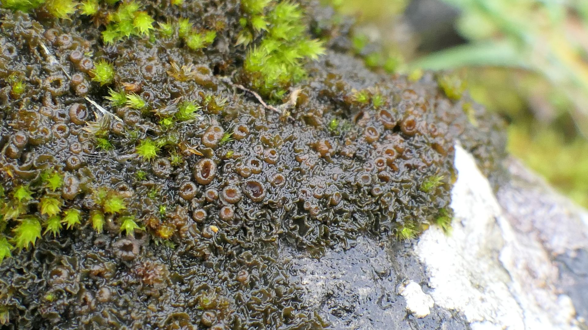 Bild 16 Keine Flechte, sondern "nur" eine große Cyanobakterienkolonie im Moos. Im trockenen Zustand wahrschienlich nicht weiter auffällig.