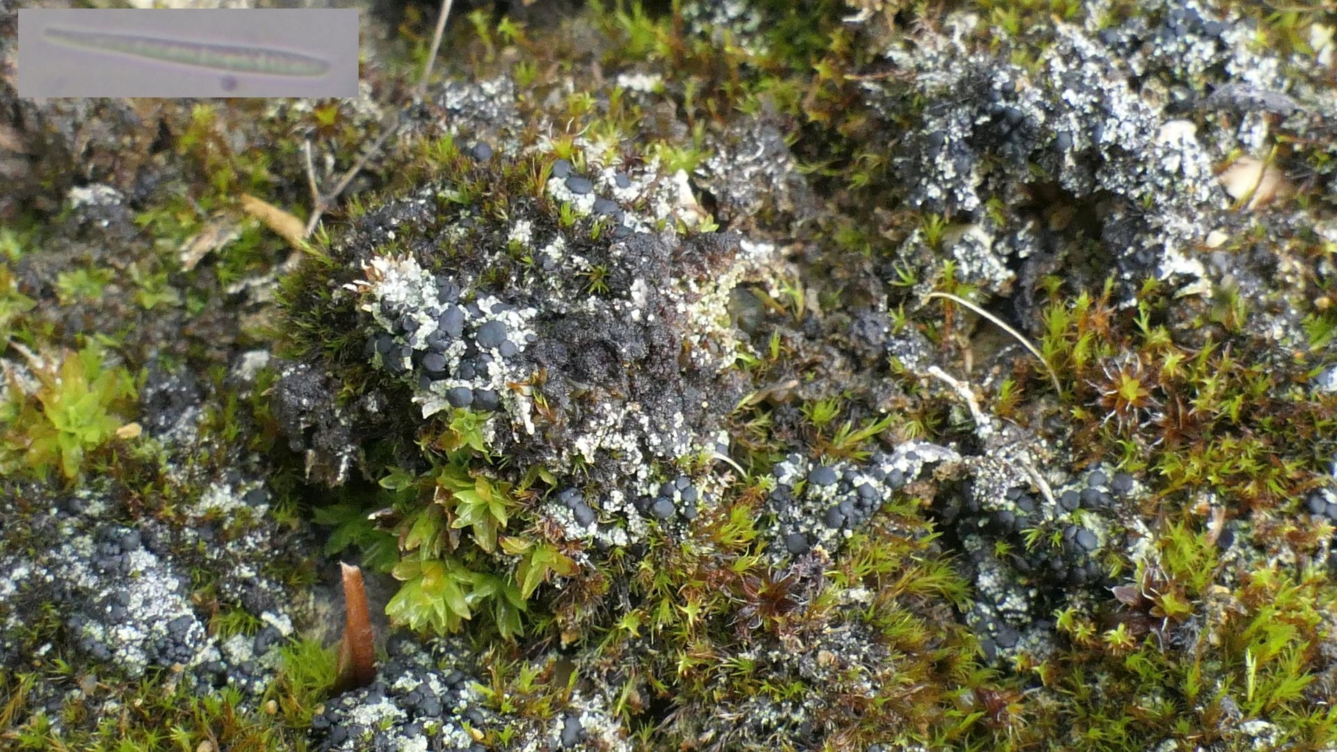 Bild 6 Eine schöne schwarz-graue Krustenflechte mit reichlich Apothecien. Noch unbestimmt... => Rinodina lecanorinum mit sehr typischen Sporen: