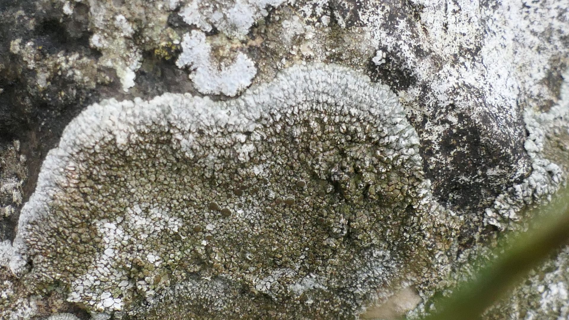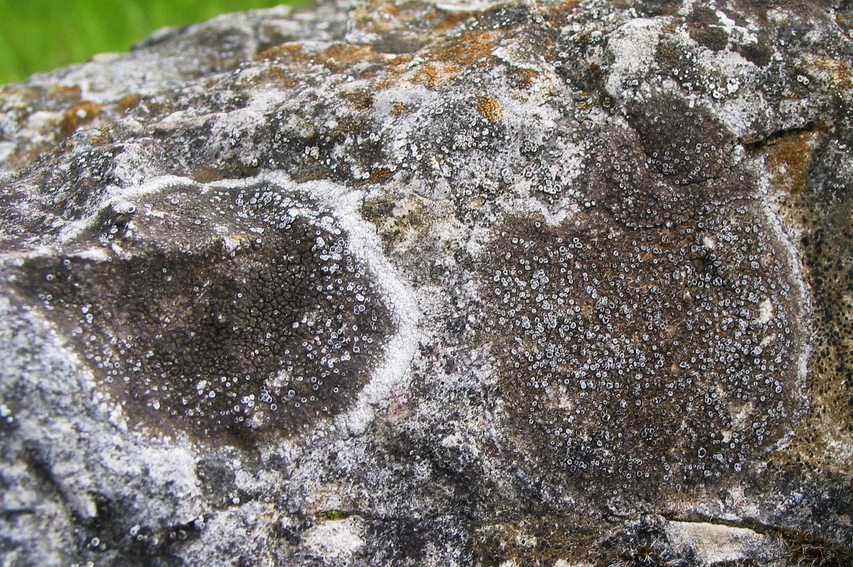 Bild 15 Ziemlich sicher Kalkstein, deshalb vielleicht etwas untypisch; vom Wuchs her, mit den konzentrisch angeordneten Apothecien, könnte dies eine Porpidia, z.B. Porpidia crustulata, sein.