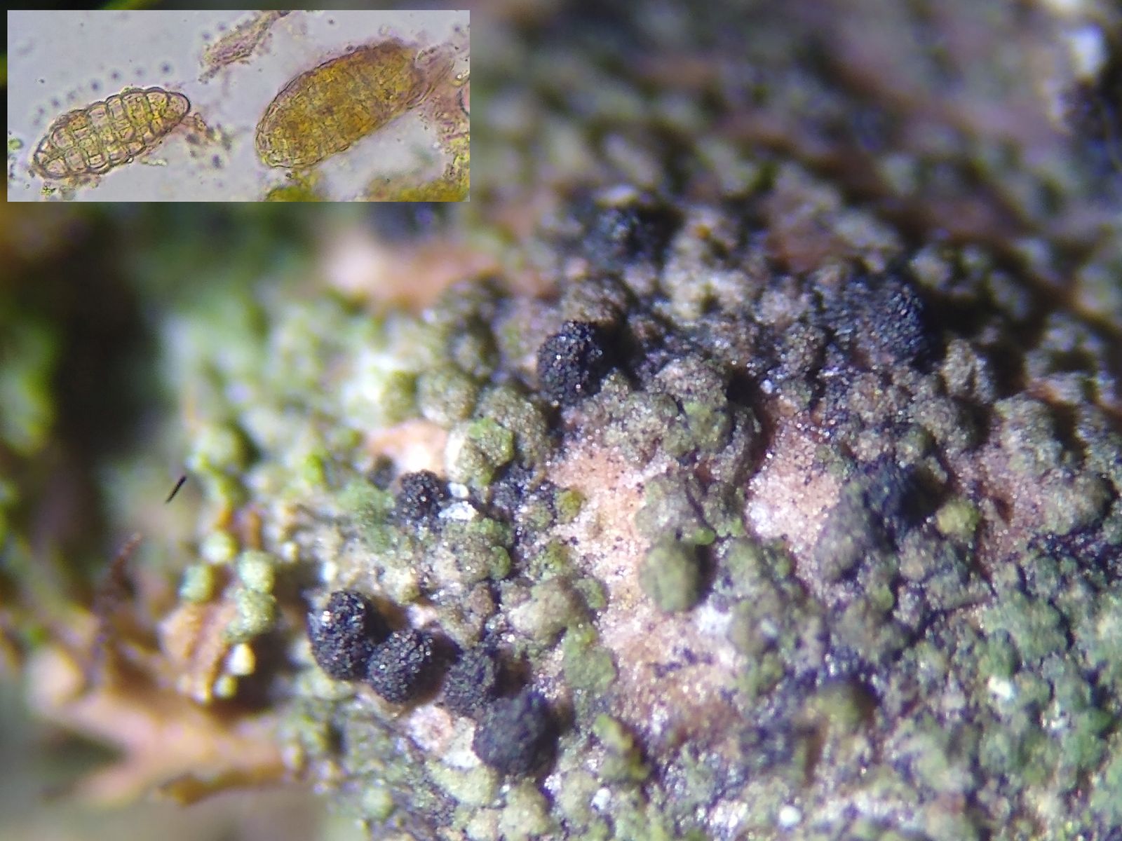 Die schwarzen kugelförmigen Perithecien (um 200µm klein) mit einer etwas in die Länge gezogenen Mündung gehören zur Flechtenart Agonimia vouauxii.