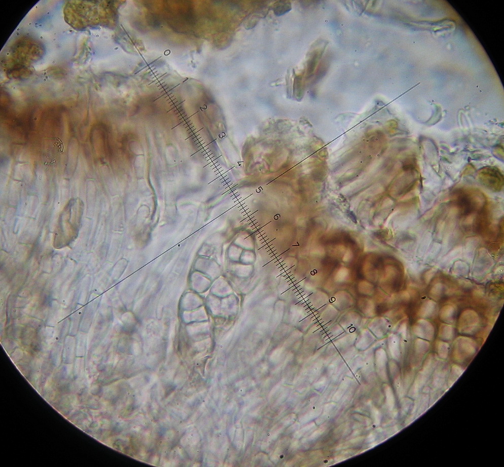 Die farblosen, gemauerten Sporen sind reichlich groß (bis über 150µm lang) für diese kleine Flechtenart und erinnern mich wegen der Vielzahl an Zellen an kleine Maiskolben.