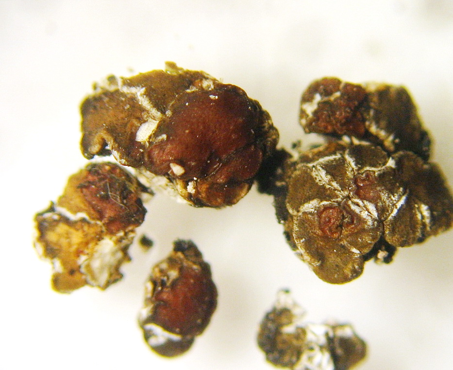 Die Probenkrümel, die du nach dem Makrobild der Sarcogyne cf regularis zeigst, gehören sicher nicht zur Sarcogyne, sondern zu Acarospora glaucocarpa (vgl. Bild 5). Die Apothecien sind zwar wie bei Sarcogyne frucht rotbraun und die Asci sehr vielsporig, die Apothecien sind aber in Schuppen eingesenkt und ohne schwarzen Eigenrand. Auf deinem Foto sind 6-7 Apothecien zu erkennen (rötlich). In der großen rechten Schuppe (olivbraun) sind 2 kleine, eingesenkt Apothecien deutlich erkennbar, ein drittes eventuell am oberen Rand zu erahnen. Die anderes Apothecien sind größer und nehmen einen erheblichen Teil der jeweiligen Schuppenfläche ein.