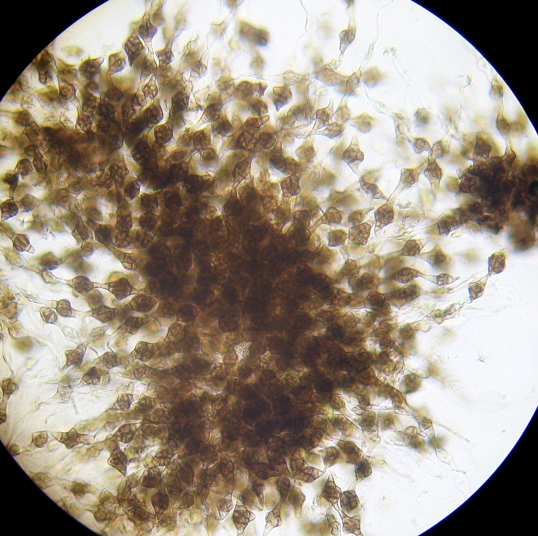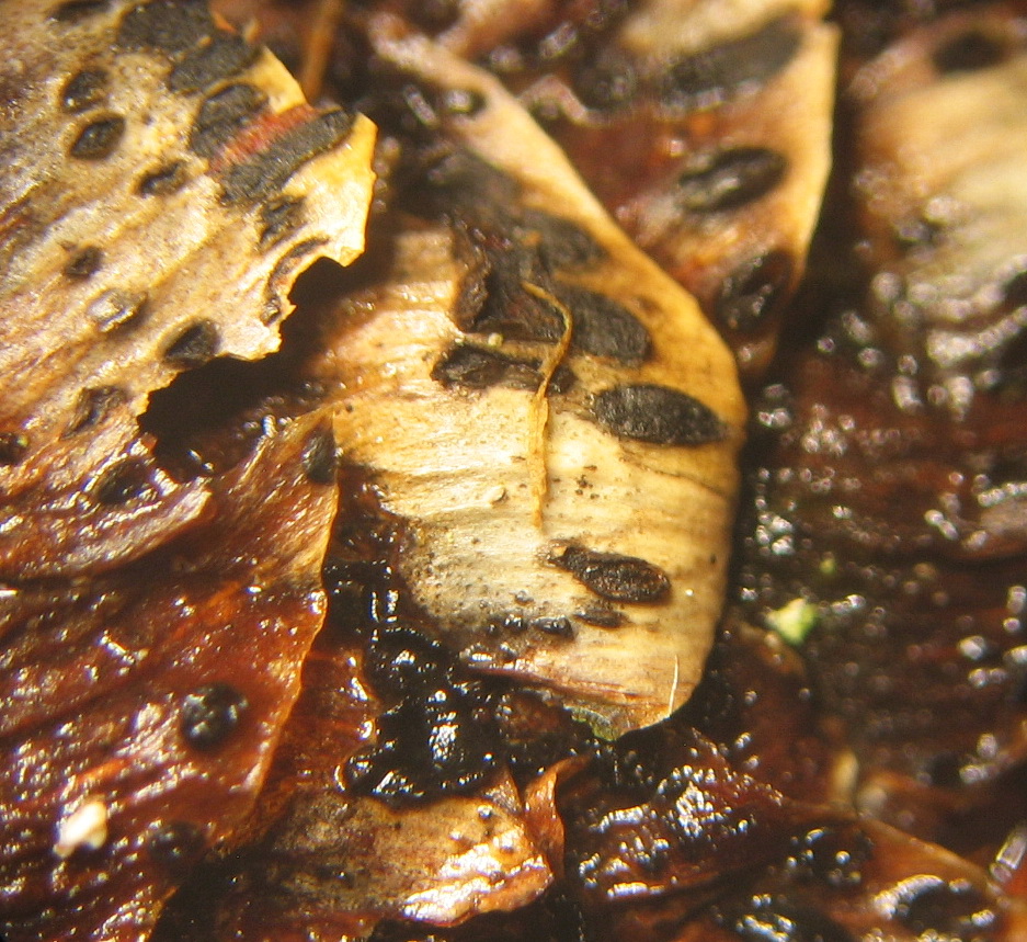 Schwarze Pyknidien auf der Oberseite der Grundschuppen sind zahlreich vorhanden.