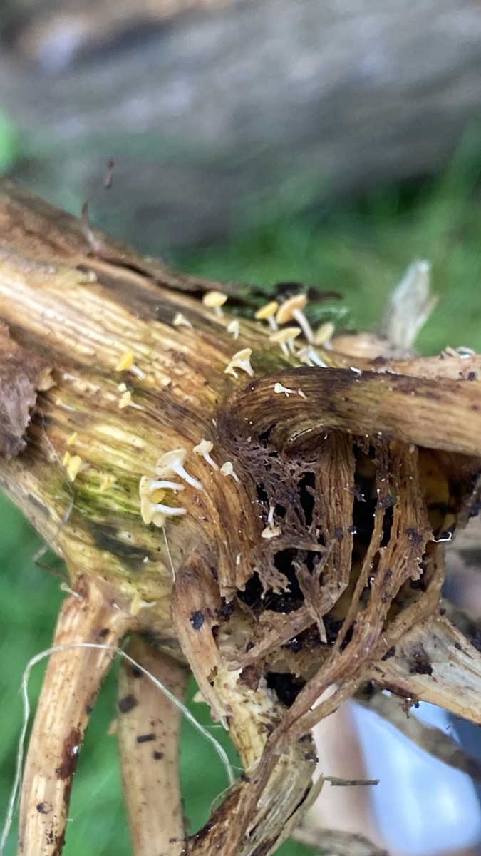 Dabei waren häufig am unteren Bereich, wo es feucht zur Erde geht, diese kleinen Pilze zu finden. Hat jemand eine Idee, so was das sein könnte?