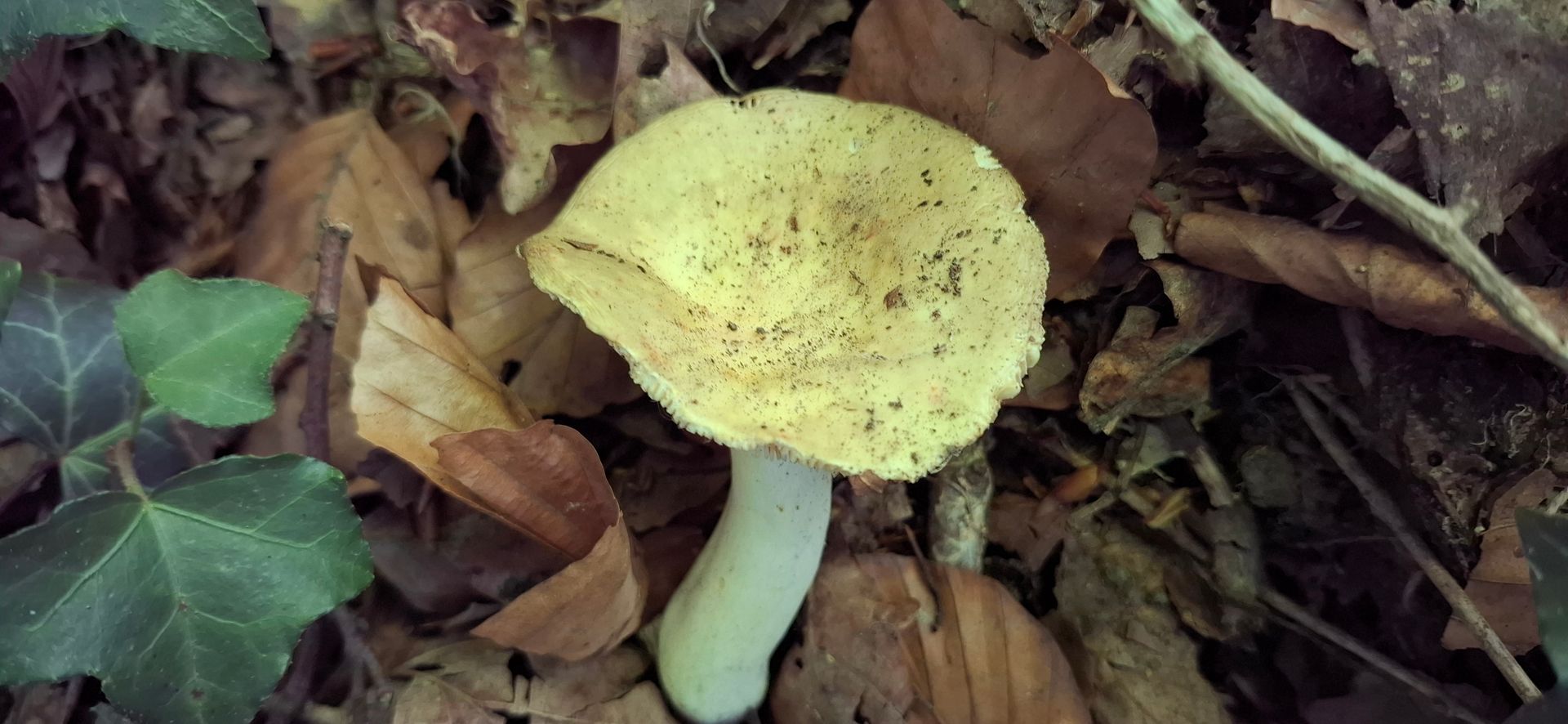 1. Ein matt gelblicher Täubling mit ockerfarbenen Lamellen, schon ziemlich trocken. Huthaut matt gelblich, zu etwas mehr als die Hlfte abziehbar, darunter weiß.