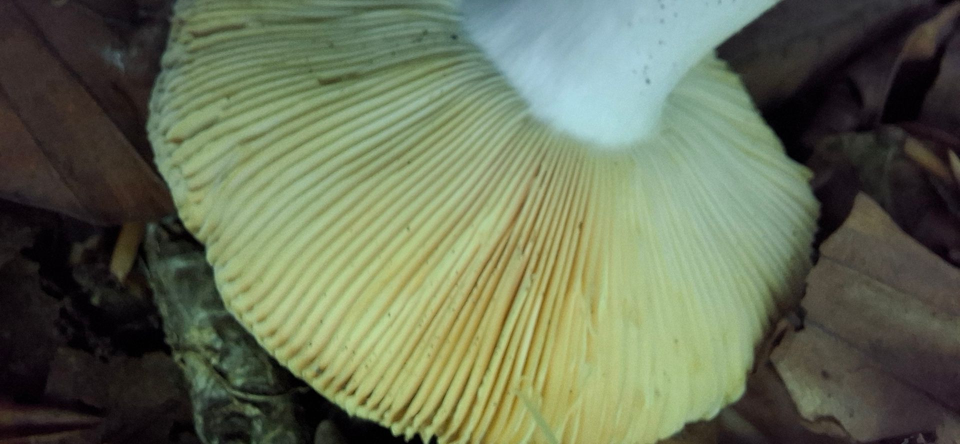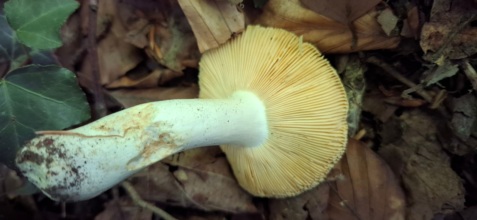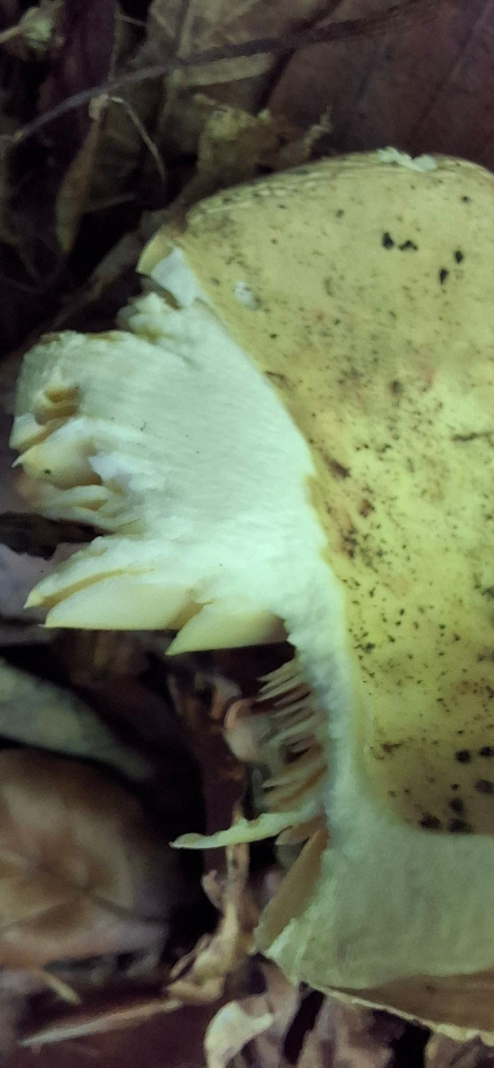 Lamellen ockergelblich. Stiel weißlich, mit bräunlich/gelblichen Verfärbungen, zur Basis etwas dicker. Lamellen deutlich brüchig. Auffälliger säuerlicher Geruch, in der Nase fast leicht stechend wirkend, wie diese leicht stechende Nöte von Essig oder wie wenn man an einem Senfglas riecht, dieses säuerlich schärfliche in der Nase.